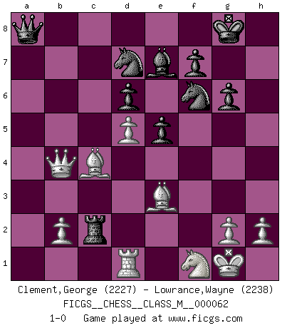 Last move : 1-0 2013 October 5 3:19:23 [Event "FICGS__CHESS__CLASS_M__000062"] [Site "FICGS"] [Date "2013.05.01"] [Round "1"] [White "Clement,George"] [Black "Lowrance,Wayne"] [Result "1-0"] [WhiteElo "2227"] [BlackElo "2238"] 1.e4 c5 2.Nf3 d6 3.d4 Nf6 4.Nc3 cxd4 5.Nxd4 a6 6.Be2 e5 7.Nb3 Be7 8.O-O Be6 9.f4 O-O 10.f5 Bd7 11.Be3 Bc6 12.Qd3 b5 13.Nd5 Bxd5 14.exd5 Nbd7 15.a4 Qc7 16.Rfd1 Rfc8 17.axb5 axb5 18.Bf2 b4 19.Rxa8 Rxa8 20.Nd2 Nc5 21.Qc4 Rc8 22.Nf1 g6 23.fxg6 hxg6 24.Be3 Qb7 25.Qb5 Qa8 26.Qc4 Ncd7 27.Qxb4 Rxc2 28.Bc4 1-0 This chess game has been lost on time (started : 2013.05.01 21:48:22) Sicilian Kingside Castling by player White (move 8) Kingside Castling by player Black (move 9) Player White won this chess game. Follow this game move after move (download)I had a toothache during the first game. In the second game I had a headache. In the third game it was an attack of rheumatism. In the fourth game, I wasn't feeling well. And in the fifth game? Well, must one have to win every game ? (Siegbert Tarrasch) Der 70jährige Viktor Kortschnoi: Die Rentenanstalt wollte mich zwingen in Rente zu gehen. Meine Frau erhält jetzt eine Pension- und ich zahle weiter in die Rentenkasse ein! (Viktor Kortschnoi) No volvere nunca a jugar contigo. Has insultado a mi amigo. - cuando un oponente se maldijo por una mala jugada (Miguel Najdorf) Demandez au pauvre Cg1 ce qu'il en pense. Eduard Gufeld à propos de la variante Saemisch de l'Est-Indienne. Life is like a ten-speed bicycle: most of us have gears we never use. (Charles M. Schulz)