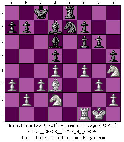 Last move : 1-0 2013 November 12 6:35:46 [Event "FICGS__CHESS__CLASS_M__000062"] [Site "FICGS"] [Date "2013.05.01"] [Round "1"] [White "Gazi,Miroslav"] [Black "Lowrance,Wayne"] [Result "1-0"] [WhiteElo "2201"] [BlackElo "2238"] 1.d4 Nf6 2.Bg5 d5 3.Nd2 c5 4.e3 cxd4 5.exd4 h6 6.Bxf6 exf6 7.Qf3 Nc6 8.c3 Qb6 9.Rb1 Ne7 10.Bd3 h5 11.Qe2 g6 12.Ngf3 Qe6 13.Bb5+ Nc6 14.O-O Qxe2 15.Bxe2 Bf5 16.Rbe1 O-O-O 17.Nh4 Bd7 18.f4 Re8 19.Bd3 Bd6 20.Rxe8+ Rxe8 21.g3 Ne7 22.a3 1-0 This chess game has been lost on time (started : 2013.05.01 21:48:22) Trompowsky attack (Ruth, Opovcensky Opening) Kingside Castling by player White (move 14) Queenside Castling by player Black (move 16) Player White won this chess game. Follow this game move after move (download)When you see a good move, look for a better one. (Emanuel Lasker) Wer wird heute Abend ihr Gegner sein? -- Heute Abend spiele ich gegen die schwarzen Steine. (Akiba Rubinstein) El Ajedrez se juega con la mente... ¡no con las manos!. (Renaud y Kahn) Assurément je connaissais par expérience le mystérieux attrait de ce jeu royal, le seul entre tous les jeux inventés par les hommes qui échappe souverainement à la tyrannie du hasard, le seul où l'on ne doive sa victoire qu'à son intelligence ou plutôt à une certaine forme d'intelligence. Mais n'est-ce pas déjà le limiter injurieusement que d'appeler les échecs un jeu ? N'est-ce pas une science, un art ou quelque chose qui, comme le cercueil de Mahomet entre ciel et terre, est suspendu entre l'un et l'autre, et qui réunit un nombre incroyable de contraires ? [...] C'est une pensée qui ne mène à rien, une mathématique qui n'établit rien, un art qui ne laisse pas d'uvre, une architecture sans matière; et il l'a prouvé néanmoins qu'il était plus durable, à sa manière, que les livres ou que tout autre monument, ce jeu unique qui appartient à tous les peuples et à tous les temps, et dont personne ne sait quel dieu en fit don à la terre pour tuer l'ennui, pour aiguiser l'esprit et stimuler l'âme. Où commence-t-il, où finit-il ? (Stefan Zweig) The Internet isn't free. It just has an economy that makes no sense to capitalism. (Brad Shapcott)