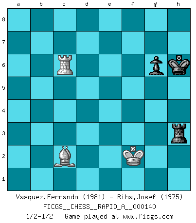 Last move : 1/2-1/2 2013 August 3 17:0:42 [Event "FICGS__CHESS__RAPID_A__000140"] [Site "FICGS"] [Date "2013.05.02"] [Round "1"] [White "Vasquez,Fernando"] [Black "Riha,Josef"] [Result "1/2-1/2"] [WhiteElo "1981"] [BlackElo "1975"] 1.e4 e5 2.Nf3 Nc6 3.d4 exd4 4.Nxd4 Bc5 5.Nxc6 Qf6 6.Qf3 bxc6 7.Nd2 d6 8.Bd3 a5 9.O-O Qxf3 10.Nxf3 f6 11.Re1 Bg4 12.h3 Bxf3 13.gxf3 Ne7 14.f4 Kf7 15.Bd2 d5 16.Rad1 a4 17.c3 g6 18.Kg2 Nc8 19.f5 Nd6 20.fxg6+ hxg6 21.exd5 cxd5 22.Bf4 Rhb8 23.Re2 Rb7 24.Bc2 c6 25.Bxd6 Bxd6 26.c4 Ra5 27.b3 f5 28.cxd5 cxd5 29.bxa4 Rb2 30.Bd3 Rxe2 31.Bxe2 Rxa4 32.Rxd5 Rxa2 33.Bc4 Rc2 34.Rxf5+ Kg7 35.Rd5 Bb4 36.Rd7+ Kh6 37.Bd3 Ra2 38.Rc7 Be1 39.Bc2 Ra3 40.Rc6 Bxf2 41.Kxf2 Rxh3 1/2-1/2 Scotch game Kingside Castling by player White (move 9) 10 pieces endgame at move 32 : White KRBPP , Black KRBPP WHITE : King + 1 Rook 1 Bishop 2 Pawns BLACK : King + 1 Rook 1 Bishop 2 Pawns 9 pieces endgame at move 34 : White KRBPP , Black KRBP WHITE : King + 1 Rook 1 Bishop 2 Pawns BLACK : King + 1 Rook 1 Bishop 1 Pawn 8 pieces endgame at move 40 : White KRBP , Black KRBP WHITE : King + 1 Rook 1 Bishop 1 Pawn BLACK : King + 1 Rook 1 Bishop 1 Pawn 7 pieces endgame at move 41 : White KRBP , Black KRP WHITE : King + 1 Rook 1 Bishop 1 Pawn BLACK : King + 1 Rook 1 Pawn 6 pieces endgame at move 41 : White KRB , Black KRP WHITE : King + 1 Rook 1 Bishop BLACK : King + 1 Rook 1 Pawn This chess game ended in a draw. Follow this game move after move (download)Chess is above all, a fight ! (Emanuel Lasker) Das Schach ist nichts für kleine Geister, es beansprucht einen vollen Mann, der sich nicht sklavisch an das Überlieferte hält, sondern selbständig die Tiefen des Spiels zu ergründen sucht. (Wilhelm Steinitz) A la fecha, Fischer esta simplemente un nivel arriba de todos los mejores jugadores de Ajedrez del mundo. (John Jacobs) Lorsque vous vous retrouvez devant une position atroce, ne tendez pas un ultime piège dérisoire avec l'intention d'abandonner si l'adversaire le déjoue ! Faites-vous plutôt un devoir de résister comme si votre vie en dépendait. Jouez le coup qui vous déplairait au centuple si vous étiez dans la peau de votre tortionnaire ! The only sure thing about luck is that it will change. (Wilson Mizner)