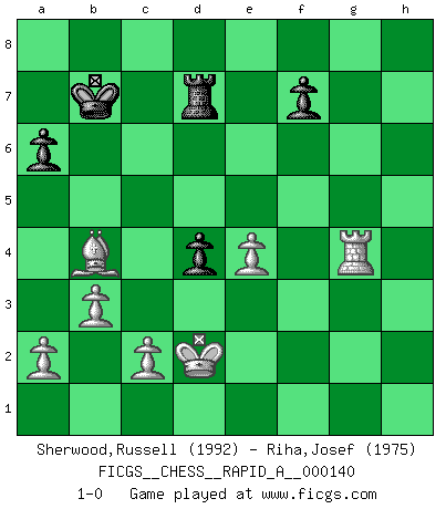 Last move : 1-0 2013 July 20 9:26:3 [Event "FICGS__CHESS__RAPID_A__000140"] [Site "FICGS"] [Date "2013.05.02"] [Round "1"] [White "Sherwood,Russell"] [Black "Riha,Josef"] [Result "1-0"] [WhiteElo "1992"] [BlackElo "1975"] 1.e4 c5 2.Nf3 d6 3.d4 cxd4 4.Nxd4 Nf6 5.Nc3 e6 6.g4 h6 7.h4 Be7 8.Qf3 Nc6 9.Nxc6 bxc6 10.g5 Nd7 11.gxh6 gxh6 12.Bf4 Ne5 13.Qg3 Ng6 14.Be3 h5 15.O-O-O e5 16.Bc4 Bxh4 17.Qg2 Qf6 18.Kb1 Bg4 19.Be2 Bd7 20.Qf1 Qe7 21.Ba6 Bg4 22.Be2 Be6 23.Bc4 Bf6 24.Bxe6 Qxe6 25.Qa6 Qd7 26.Na4 Rb8 27.Nc5 Qc7 28.Nb3 Bg7 29.Na5 Ne7 30.Rhg1 Rh7 31.b3 Rd8 32.f4 h4 33.Nc4 Rd7 34.fxe5 Bxe5 35.Nxe5 dxe5 36.Rdf1 h3 37.Bc5 Qb8 38.Rf2 Qd8 39.Kc1 Qc7 40.Kb2 Qb7 41.Qc4 h2 42.Rh1 Ng6 43.Rfxh2 Rxh2 44.Rxh2 Kd8 45.Qc3 Kc8 46.Rf2 Qc7 47.Rf5 Kb7 48.Rf6 Ka8 49.Bb4 Qb6 50.Rxc6 Qd4 51.Rf6 Kb7 52.Qxd4 exd4 53.Kc1 Ne5 54.Kd2 Ng4 55.Rf4 a6 56.Rxg4 1-0 Sicilian : Scheveningen, Keres attack Queenside Castling by player White (move 15) Player White won this chess game. Follow this game move after move (download)There are tough players and nice guys, and I'm a tough player. (Bobby Fischer) Jeder leidlich begabte Spieler, er braucht keineswegs hervorragend veranlagt zu sein, kann es zum Meister bringen. Aber das ist ja auch gar nicht nötig! Der richtige Standpunkt ist es, zu seinem Vergnügen zu spielen, und man glaube ja nicht, dass der Genuss proportional dem Können sei. (Siegbert Tarrasch) Si yo gano un torneo, yo lo gano por mí mismo. Yo hago las jugadas. Nadie me ayuda. (Bobby Fischer) Les échecs, c'est l'imagination. (David Bronstein) If we knew what we were doing, we would not call it research. (Albert Einstein)
