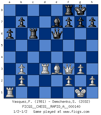 Last move : 1/2-1/2 2013 June 10 12:33:55 [Event "FICGS__CHESS__RAPID_A__000140"] [Site "FICGS"] [Date "2013.05.02"] [Round "1"] [White "Vasquez,Fernando"] [Black "Demchenko,Sergey"] [Result "1/2-1/2"] [WhiteElo "1981"] [BlackElo "2032"] 1.e4 c5 2.c3 Nf6 3.e5 Nd5 4.d4 cxd4 5.Nf3 Nc6 6.Bc4 Nb6 7.Bb3 d5 8.exd6 Qxd6 9.O-O Be6 10.Nxd4 Nxd4 11.cxd4 Bxb3 12.axb3 e6 13.Nc3 Be7 14.Qf3 Qd7 15.Rd1 O-O 16.d5 Nxd5 17.Nxd5 exd5 18.Rxd5 Qe6 19.Be3 a6 20.g3 Rac8 21.Rd3 Rc6 1/2-1/2 Sicilian : Alapin's variation (2.c3) Kingside Castling by player White (move 9) Kingside Castling by player Black (move 15) This chess game ended in a draw. Follow this game move after move (download)A win by an unsound combination, however showy, fills me with artistic horror. (Wilhelm Steinitz) Modernes Schach sorgt sich zuviel um Dinge wie Bauernstruktur usw. Vergessen Sie das, Schachmatt beendet das Spiel! (Nigel Short) Hay jugadores fuertes y personas amables y yo soy un jugador fuerte. (Bobby Fischer) Vous n'êtes pas toujours obligé de jouer le meilleur coup. Un coup doit être actif, entreprenant, correct et beau ! (David Bronstein) When you've done things right people won't know you've done anything at all. (Futurama)