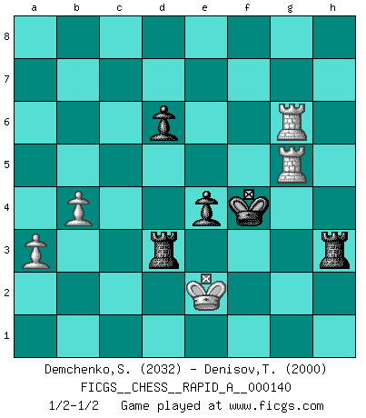 Last move : 1/2-1/2 2013 May 25 16:33:0 [Event "FICGS__CHESS__RAPID_A__000140"] [Site "FICGS"] [Date "2013.05.02"] [Round "1"] [White "Demchenko,Sergey"] [Black "Denisov,Timofey"] [Result "1/2-1/2"] [WhiteElo "2032"] [BlackElo "2000"] 1.e4 c5 2.Nf3 d6 3.d4 cxd4 4.Nxd4 Nf6 5.Nc3 a6 6.f3 e5 7.Nb3 Be6 8.Be3 h5 9.Qd2 Nbd7 10.Nd5 Nxd5 11.exd5 Bf5 12.Be2 Qh4+ 13.Bf2 Qf6 14.Bd3 Be7 15.O-O O-O 16.Rae1 Rac8 17.Na5 Bxd3 18.Qxd3 Nc5 19.Qa3 Bd8 20.Re2 Bxa5 21.Qxa5 Qg6 22.Qb6 Qf6 23.b3 Qd8 24.Qb4 b5 25.Qd2 Re8 26.Rfe1 Qe7 27.Qb4 Rc7 28.Qa5 Rb8 29.f4 f6 30.fxe5 fxe5 31.h3 Qf7 32.Rd1 Rf8 33.Qb6 Qd7 34.Bxc5 Rxc5 35.Qxa6 h4 36.Qb6 Qc7 37.Qxc7 Rxc7 38.c4 bxc4 39.Rc1 Rfc8 40.Rec2 c3 41.Kf2 Kf7 42.Ke3 Rc5 43.Ke4 Kg6 44.g3 Rb8 45.Rxc3 Rb4+ 46.Ke3 Rxd5 47.a3 Rbd4 48.gxh4 Rxh4 49.Ke2 Kf5 50.Rf1+ Ke6 51.Rg1 e4 52.Rg6+ Kf7 53.Rcg3 Rd3 54.Rxg7+ Kf6 55.b4 Rxh3 56.R7g6+ Ke5 57.R3g5+ Kf4 58.Rg4+ Ke5 59.R4g5+ Kf4 1/2-1/2 Sicilian : Najdorf Kingside Castling by player White (move 15) Kingside Castling by player Black (move 15) 10 pieces endgame at move 55 : White KRRPP , Black KRRPP WHITE : King + 2 Rooks 2 Pawns BLACK : King + 2 Rooks 2 Pawns This chess game ended in a draw. Follow this game move after move (download)If a ruler does not understand Chess, how can he rule over a kingdom ? (King Khusros II) Ohne Leiden bildet sich kein Charakter. (Ernst Freiherr von Feuchtersleben) A la fecha, Fischer esta simplemente un nivel arriba de todos los mejores jugadores de Ajedrez del mundo. (John Jacobs) Demandez au pauvre Cg1 ce qu'il en pense. Eduard Gufeld à propos de la variante Saemisch de l'Est-Indienne. Every man's memory is his private literature. (Aldous Huxley)