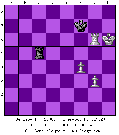 Last move : 1-0 2013 September 17 2:14:34 [Event "FICGS__CHESS__RAPID_A__000140"] [Site "FICGS"] [Date "2013.05.02"] [Round "1"] [White "Denisov,Timofey"] [Black "Sherwood,Russell"] [Result "1-0"] [WhiteElo "2000"] [BlackElo "1992"] 1.d4 Nf6 2.c4 g6 3.Nc3 d5 4.cxd5 Nxd5 5.e4 Nxc3 6.bxc3 Bg7 7.Nf3 c5 8.Rb1 O-O 9.Be2 cxd4 10.cxd4 Qa5+ 11.Bd2 Qxa2 12.O-O b6 13.Qc1 Bb7 14.Bc4 Qa4 15.Bb5 Qa2 16.Re1 Rc8 17.Qd1 Rc2 18.Bd3 Rc8 19.h4 Qe6 20.h5 Qd7 21.Bf4 Qg4 22.Qd2 Qxh5 23.Be2 Ba6 24.Rec1 Rd8 25.Bd1 Qa5 26.Qe3 e6 27.Bb3 Nd7 28.Ra1 Qb5 29.Bg5 Rdc8 30.Ba4 Rxc1+ 31.Qxc1 Qc4 32.Bxd7 Qxc1+ 33.Rxc1 Bb7 34.Bc6 Bxc6 35.Rxc6 h6 36.Be7 b5 37.d5 exd5 38.exd5 Bf8 39.d6 Bxe7 40.dxe7 Re8 41.Rc7 a5 42.Nd4 Kg7 43.Nxb5 Kf6 44.Ra7 Rxe7 45.Rxa5 h5 46.Nc3 Kg7 47.Kh2 Re6 48.Kg3 Rb6 49.f3 Rc6 50.Ne4 Kh6 51.Kf4 Rc7 52.Rc5 Re7 53.g3 Ra7 54.Ke5 Kg7 55.f4 Re7+ 56.Kd4 Rb7 57.Ke3 Rb3+ 58.Kf2 Rb2+ 59.Kf3 Rb3+ 60.Kg2 Rb4 61.Nd6 Rd4 62.Nc4 Rd7 63.Kh3 Ra7 64.Rc6 Rb7 65.Rd6 Kf8 66.Kh4 Ke7 67.Rb6 Rd7 68.Ne5 Rc7 69.Nxg6+ fxg6 70.Rxg6 Kf7 71.Kxh5 Rc5+ 72.Kh6 1-0 This chess game has been lost on time (started : 2013.05.02 16:53:52) King's Indian defense, 3.Nc3 Kingside Castling by player Black (move 8) Kingside Castling by player White (move 12) 10 pieces endgame at move 45 : White KRNPP , Black KRPPP WHITE : King + 1 Rook 1 Knight 2 Pawns BLACK : King + 1 Rook 3 Pawns 9 pieces endgame at move 69 : White KRNPP , Black KRPP WHITE : King + 1 Rook 1 Knight 2 Pawns BLACK : King + 1 Rook 2 Pawns 8 pieces endgame at move 69 : White KRPP , Black KRPP WHITE : King + 1 Rook 2 Pawns BLACK : King + 1 Rook 2 Pawns 7 pieces endgame at move 70 : White KRPP , Black KRP WHITE : King + 1 Rook 2 Pawns BLACK : King + 1 Rook 1 Pawn 6 pieces endgame at move 71 : White KRPP , Black KR WHITE : King + 1 Rook 2 Pawns BLACK : King + 1 Rook Player White won this chess game. Follow this game move after move (download)First-class players lose to second class players because second-class players sometimes play a first-class game. (Tarrasch) Frage: Wie viele Autos haben Sie schon zerstört? - Antwort: Nur zwei. (Loek van Wely) Repentinamente, me resultaba obvio en mi analisis que yo había pasado por alto lo que Fischer había visto en el tablero con la mas grande facilidad. (Mikhail Botvinnik) RxDa4 pat (...) He who fights with monsters should be careful lest he thereby become a monster. (Friedrich Nietzsche, Beyond Good and Evil)