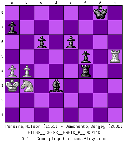 Last move : 0-1 2013 June 2 21:39:12 [Event "FICGS__CHESS__RAPID_A__000140"] [Site "FICGS"] [Date "2013.05.02"] [Round "1"] [White "Pereira,Nilson"] [Black "Demchenko,Sergey"] [Result "0-1"] [WhiteElo "1953"] [BlackElo "2032"] 1.e4 c5 2.Nf3 d6 3.d4 cxd4 4.Nxd4 Nf6 5.Nc3 g6 6.Be3 Bg7 7.f3 Nc6 8.Qd2 O-O 9.O-O-O d5 10.exd5 Nxd5 11.Nxc6 bxc6 12.Bd4 Bxd4 13.Qxd4 Qb6 14.Na4 Qc7 15.h4 Rd8 16.h5 Bf5 17.hxg6 Bxg6 18.Bd3 Nf4 19.Qc4 Nxd3+ 20.cxd3 Qe5 21.Nc5 Rd4 22.Qc3 Qg5+ 23.Kb1 Rd5 24.Rc1 Qxg2 25.Rhe1 Rb8 26.b3 Re8 27.f4 Qf3 28.Rf1 Qe3 29.Ka1 e6 30.Kb2 Red8 31.a4 h5 32.Ka3 Rf5 33.Qb4 R8d5 34.Qe4 Qd2 35.Rcd1 Qa5 36.b4 Qd8 37.Nb3 Rf6 38.Qe3 Rxd3 39.Rxd3 Qxd3 40.Qxd3 Bxd3 41.Rh1 Rxf4 42.Rxh5 f5 0-1 Sicilian : Dragon, Yugoslav attack Kingside Castling by player Black (move 8) Queenside Castling by player White (move 9) Player Black won this chess game. Follow this game move after move (download)With or without the title, Bobby Fischer was unquestionably the greatest player of his time. (Burt Hochberg) Man braucht nicht immer den besten Zug zu spielen: Ein Zug muß aktiv, unternehmungslustig, korrekt und schön sein. (David Bronstein) En manos de Fischer's, una diminuta ventaja teórica es tan buena como tener una Reina de ventaja. (Isaac Kashdan) Karpov est une pièce de musée. (Garry Kasparov) Life is pleasant. Death is peaceful. It's the transition that's troublesome. (Isaac Asimov)