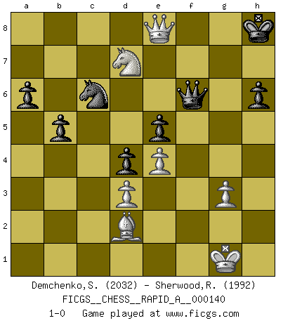 Last move : 1-0 2013 July 18 21:49:12 [Event "FICGS__CHESS__RAPID_A__000140"] [Site "FICGS"] [Date "2013.05.02"] [Round "1"] [White "Demchenko,Sergey"] [Black "Sherwood,Russell"] [Result "1-0"] [WhiteElo "2032"] [BlackElo "1992"] 1.e4 e5 2.Nf3 Nc6 3.Bb5 a6 4.Ba4 Nf6 5.O-O Be7 6.Re1 b5 7.Bb3 O-O 8.h3 Bb7 9.d3 d6 10.a3 Na5 11.Ba2 c5 12.Nbd2 Nc6 13.Nf1 Bc8 14.c3 Be6 15.Bxe6 fxe6 16.b4 Nh5 17.N1h2 Rc8 18.Ng4 Qc7 19.h4 Nf4 20.g3 Nh5 21.Be3 Nf6 22.Nxf6+ Rxf6 23.Nd2 h6 24.Qe2 Rf7 25.Rec1 d5 26.Qg4 d4 27.cxd4 exd4 28.Bf4 e5 29.Bxh6 Rcf8 30.bxc5 Kh8 31.Bg5 Rxf2 32.Rab1 Kh7 33.Rf1 Rxf1+ 34.Rxf1 Bxc5 35.Rxf8 Bxf8 36.Qf5+ Kg8 37.Qe6+ Kh8 38.Nf3 Qd6 39.Qf7 Qxa3 40.h5 Kh7 41.Bd2 Kh8 42.Nh4 Kh7 43.Ng6 Qd6 44.Nxf8+ Kh8 45.h6 Qf6 46.Qe8 gxh6 47.Nd7 1-0 Ruy Lopez : Closed, 7...O-O Kingside Castling by player White (move 5) Kingside Castling by player Black (move 7) Player White won this chess game. Follow this game move after move (download)Modern Chess is too much concerned with things like Pawn structure. Forget it, Checkmate ends the game. (Nigel Short) Schachspieler können ausgezeichnet Varianten am Schachbrett berechnen, aber nicht im realen Leben. Zu stark ist der Individualismus im Schach ausgeprägt, und für viele ist ein kleiner momentaner persönlicher Vorteil wichtiger als ein weit größerer Vorteil von morgen. (Anatoly Karpov) Antes de los Finales, los dioses han colocado el Juego Medio. (Siegbert Tarrasch) Donnez-moi un Cavalier en 6e et je gagnerais toutes mes parties. (Steinitz) A generalist learns less and less about more and more until he knows nothing about everything. (Author unknown)