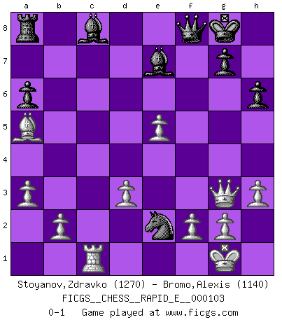 Last move : 0-1 2013 May 7 22:0:23 [Event "FICGS__CHESS__RAPID_E__000103"] [Site "FICGS"] [Date "2013.05.03"] [Round "1"] [White "Stoyanov,Zdravko"] [Black "Bromo,Alexis"] [Result "0-1"] [WhiteElo "1270"] [BlackElo "1140"] 1.e4 e5 2.Nf3 Nc6 3.Bb5 d6 4.Bxc6+ bxc6 5.h3 h6 6.a3 Ba6 7.d3 Nf6 8.O-O c5 9.Re1 Be7 10.c4 O-O 11.Nc3 c6 12.Qa4 Bb7 13.Bd2 d5 14.cxd5 cxd5 15.Nxe5 d4 16.Nb5 a6 17.Nxf7 Kxf7 18.e5 Nd5 19.Ba5 Qb8 20.Rac1 Kg8 21.Nxd4 cxd4 22.Qxd4 Rf4 23.Re4 Rxe4 24.Qxe4 Qf8 25.Qg6 Nf4 26.Qg4 Bc8 27.Qg3 Ne2+ 0-1 Ruy Lopez : Old Steinitz defense Kingside Castling by player White (move 8) Kingside Castling by player Black (move 10) Player Black won this chess game. Follow this game move after move (download)It began to feel as though you were playing against Chess itself. - On playing against Robert Fischer. (Walter Shipman) Weshalb minderdergeübte Spieler mit g2-g4 beginnen? Die betreffenden sind unschlüssig, ob sie nun rechts (h4) oder links (f4) beginnen sollen, und in ihrer Ratlosigkeit entschliessen sie sich nach guter Bürgerart dazu, den goldenen Mittelweg zu wählen. (Aaron Nimzowitsch) Peones: ellos son el alma de esta partida, solos forman el ataque y la defensa. (Philidor) Le système Elo représente seulement une moyenne. Il est simplement un indicateur de votre stabilité. (Anatoli Karpov) Perhaps the current trend of many chess professionals taking up the more lucrative pastime of poker is not a wholly negative one. It may not be too late for humans to relearn how to take risks in order to innovate and thereby maintain the advanced lifestyles we enjoy. And if it takes a poker-playing supercomputer to remind us that we can't enjoy the rewards without taking the risks, so be it. (The Chess Master and the Computer, by Garry Kasparov - 2010)