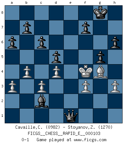 Last move : 0-1 2013 May 6 21:25:22 [Event "FICGS__CHESS__RAPID_E__000103"] [Site "FICGS"] [Date "2013.05.03"] [Round "1"] [White "Cavaille,Cedric"] [Black "Stoyanov,Zdravko"] [Result "0-1"] [WhiteElo "0982"] [BlackElo "1270"] 1.d4 d5 2.Nc3 e6 3.e4 a6 4.exd5 exd5 5.Nf3 h6 6.Be2 Bb4 7.Bd2 Nf6 8.a3 Ba5 9.b4 Bb6 10.O-O Ne4 11.Bd3 Nxc3 12.Bxc3 O-O 13.Bd2 Bg4 14.c3 Nd7 15.Be2 Re8 16.h3 Bh5 17.Re1 Nf6 18.Nh2 Bg6 19.Bf3 Qd6 20.Rxe8+ Rxe8 21.Ng4 Nxg4 22.Bxg4 c6 23.Qc2 Bxc2 24.Re1 Rxe1+ 25.Bxe1 Bc7 26.g3 Qe7 27.Bd2 Qe4 28.f3 Qd3 29.Be1 Qd1 30.Kf2 Bxg3+ 31.Kxg3 Qxe1+ 32.Kf4 g5+ 0-1 Queen's pawn : Chigorin variation Kingside Castling by player White (move 10) Kingside Castling by player Black (move 12) Player Black won this chess game. Follow this game move after move (download)The tactician must know what to do whenever something needs doing; the strategist must know what to do when nothing needs doing. (Savielly Tartakover) Oft bringt ein stiller Zug das Erdbeben. (Richard Reti) Entre mas años cumplo, mas valoro los Peones. (Keres) Les Echecs ne sont pas pour les âmes timides. Ils requièrent un homme entier, qui ne s'arrête pas aveuglément à ce qui a été déjà établi, mais qui tente individuellement de sonder les profondeurs du jeu. (W. Steinitz) Your best chance to get a Royal Flush in a casino is in the bathroom. (Anonymous)