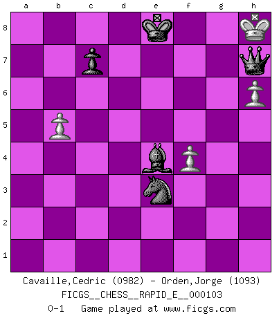 Last move : 0-1 2013 June 7 22:16:14 [Event "FICGS__CHESS__RAPID_E__000103"] [Site "FICGS"] [Date "2013.05.03"] [Round "1"] [White "Cavaille,Cedric"] [Black "Orden,Jorge"] [Result "0-1"] [WhiteElo "0982"] [BlackElo "1093"] 1.d4 d5 2.Nc3 Nf6 3.Bg5 e6 4.Nf3 Be7 5.Bxf6 Bxf6 6.e4 dxe4 7.Nxe4 a6 8.Nxf6+ Qxf6 9.Be2 O-O 10.Qd2 Rd8 11.O-O b5 12.b4 Bb7 13.c3 Nd7 14.Qe3 a5 15.a3 a4 16.Bxb5 Nb6 17.Qe5 Nd5 18.Qxf6 Nxf6 19.Ne5 Nd5 20.Rac1 Ba6 21.Bc6 Nb6 22.Bxa8 Rxa8 23.Rfe1 f6 24.Nc6 Re8 25.Rcd1 Nc4 26.d5 Nb2 27.Rxe6 Rxe6 28.dxe6 Nxd1 29.g4 Nxc3 30.e7 Kf7 31.Kg2 Bb5 32.Na7 Bd7 33.Kg3 Kxe7 34.f4 Nb1 35.g5 Nxa3 36.gxf6+ gxf6 37.Kh4 Nc2 38.b5 a3 39.Kh5 a2 40.Kh6 a1Q 41.Kxh7 Qxa7 42.h4 Qc5 43.Kg6 Ne3 44.h5 Bf5+ 45.Kg7 Ke8 46.Kxf6 Be4 47.h6 Qf5+ 48.Kg7 Qg6+ 49.Kh8 Qh7+ 0-1 Richter-Veresov attack Kingside Castling by player Black (move 9) Kingside Castling by player White (move 11) Promotion Queen by player Black (move 40) 10 pieces endgame at move 41 : White KPPP , Black KQBNPP WHITE : King + 3 Pawns BLACK : King + 1 Queen 1 Bishop 1 Knight 2 Pawns 9 pieces endgame at move 46 : White KPPP , Black KQBNP WHITE : King + 3 Pawns BLACK : King + 1 Queen 1 Bishop 1 Knight 1 Pawn Player Black won this chess game. Follow this game move after move (download)I'd rather have a Pawn than a finger. (Reuben Fine) Man kann eine Schachpartie nur gewinnen, wenn das Gleichgewicht gestört ist. In einer Stellung mit ungestörtem Gleichgewicht ist auch das größte Genie hilflos - in der Stellung steckt dann eben kein genialer Einfall. (Wilhelm Steinitz) Yo siempre he tenido un ligero sentimiento de lástima por una persona que no tiene conocimiento del Ajedrez. (Siegbert Tarrasch) J'apprécie les joueurs d'est-indienne, c'est grâce à eux que je nourris ma famille depuis tant d'années. (Petrosian) Man is reluctant to give credit for intelligence to anyone, except his enemies. (Albert Einstein)