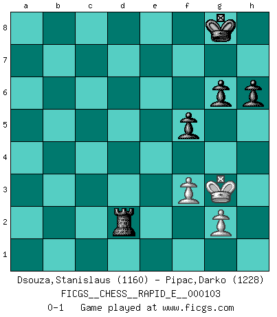 Last move : 0-1 2013 June 4 12:58:58 [Event "FICGS__CHESS__RAPID_E__000103"] [Site "FICGS"] [Date "2013.05.03"] [Round "1"] [White "Dsouza,Stanislaus"] [Black "Pipac,Darko"] [Result "0-1"] [WhiteElo "1160"] [BlackElo "1228"] 1.d4 d5 2.Nf3 h6 3.e3 Bg4 4.Be2 Nf6 5.Nc3 Nc6 6.h3 Bh5 7.O-O a6 8.Nh2 Bxe2 9.Qxe2 e5 10.dxe5 Nxe5 11.Rd1 c6 12.Ng4 Nexg4 13.hxg4 Bd6 14.b3 Qe7 15.Bb2 O-O 16.Qf3 Rae8 17.a3 Qe6 18.Rd4 Be5 19.Rb4 Re7 20.Rb1 c5 21.Ra4 b5 22.Ra5 d4 23.exd4 Bxd4 24.Nxb5 axb5 25.Bxd4 cxd4 26.Rxb5 Qxg4 27.Qxg4 Nxg4 28.Rb4 Rfe8 29.Rf1 Rd7 30.f3 Ne3 31.Rf2 d3 32.cxd3 Rxd3 33.Kh2 Rc8 34.Re2 Nc2 35.Rb7 Nxa3 36.R2e7 Rf8 37.Ra7 Rxb3 38.Kg3 Nc2 39.Rac7 Ne3 40.Ra7 Nf5+ 41.Kh2 Nxe7 42.Rxe7 Rd8 43.Re2 g6 44.Ra2 Rbd3 45.Rb2 Rd2 46.Rxd2 Rxd2 47.Kg3 f5 0-1 Queen's pawn game Kingside Castling by player White (move 7) Kingside Castling by player Black (move 15) 10 pieces endgame at move 42 : White KRPP , Black KRRPPP WHITE : King + 1 Rook 2 Pawns BLACK : King + 2 Rooks 3 Pawns 9 pieces endgame at move 46 : White KRPP , Black KRPPP WHITE : King + 1 Rook 2 Pawns BLACK : King + 1 Rook 3 Pawns 8 pieces endgame at move 46 : White KPP , Black KRPPP WHITE : King + 2 Pawns BLACK : King + 1 Rook 3 Pawns Player Black won this chess game. Follow this game move after move (download)In complicated positions, Bobby Fischer hardly had to be afraid of anybody. (Paul Keres) Ich trinke, ich rauche, ich spiele, ich liebe Frauen aber Fernschach ist ein Laster, das ich nicht habe. (Mikhail Nekhemyevich Tal) Cuando tengas duda... ¡juega al Ajedrez!. (Tevis) Les écrivains ont utilisé les échecs pour analyser les côtés extrêmes de la nature humaine. Dans ce cadre, les échecs offrent un champ d'expérimentation idéal. Mais on pourrait faire la même chose avec la peinture. Et là, en vous référant à Van Gogh, vous ne tirerez pas de conclusion définitive sur les peintres. (Gary Kasparov) There are lots of people who mistake their imagination for their memory. (Josh Bilings)
