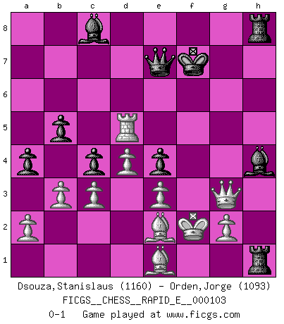 Last move : 0-1 2013 June 25 13:43:43 [Event "FICGS__CHESS__RAPID_E__000103"] [Site "FICGS"] [Date "2013.05.03"] [Round "1"] [White "Dsouza,Stanislaus"] [Black "Orden,Jorge"] [Result "0-1"] [WhiteElo "1160"] [BlackElo "1093"] 1.d4 d5 2.Nf3 Nf6 3.e3 e6 4.Bd3 Be7 5.O-O O-O 6.Re1 a6 7.Nc3 b6 8.Ne5 Bb7 9.f4 Nbd7 10.f5 c5 11.Nxd7 Qxd7 12.Qf3 c4 13.Be2 exf5 14.Bd2 Ne4 15.Nxe4 fxe4 16.Qg3 b5 17.c3 Bd6 18.Qh4 a5 19.Rf1 g6 20.Rf6 Be7 21.Bh5 Bxf6 22.Qg3 Bg7 23.Bg4 f5 24.Be2 Rf7 25.Rf1 a4 26.h4 Qe7 27.h5 Raf8 28.hxg6 hxg6 29.Qxg6 Rf6 30.Qg3 Rh6 31.Qf4 Rh4 32.Qg3 Kf7 33.Be1 Rfh8 34.Rxf5+ Bf6 35.b3 Rh1+ 36.Kf2 Bc8 37.Rxd5 Bh4 0-1 Queen's pawn game Kingside Castling by player White (move 5) Kingside Castling by player Black (move 5) Player Black won this chess game. Follow this game move after move (download)War is the child of passion, passion is the child of narcissism and narcissism is the child. (...) Another game ? (Thibault de Vassal) In Buenos Aires ist es nicht mein vorrangiges Ziel ein starkes Turnier zu organisieren, sondern ein Turnier für Gentlemen. Ich würde nie Kamsky einladen. Ich mag keine Probleme. (Miguel Najdorf) Una clavada es mas poderosa que una espada. (Fred Reinfeld) Toutes les manuvres exécutées sur une colonne ouverte ont pour but ultime l'intrusion définitive sur la septième ou la huitième rangée, en plein cur de la position ennemie. (Aaron Nimzovitch) Life is like internet, nothing interesting, but noone want to leave it. (Ilmars Cirulis)