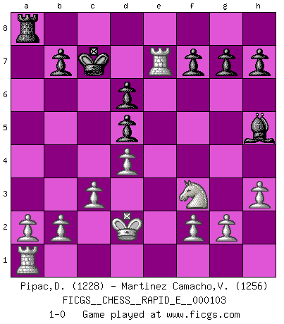 Last move : 1-0 2013 May 23 16:42:4 [Event "FICGS__CHESS__RAPID_E__000103"] [Site "FICGS"] [Date "2013.05.03"] [Round "1"] [White "Pipac,Darko"] [Black "Martinez Camacho,Victor Hugo"] [Result "1-0"] [WhiteElo "1228"] [BlackElo "1256"] 1.e4 c6 2.Nf3 d6 3.d4 Bg4 4.h3 Bh5 5.Nc3 Nf6 6.Bg5 Nbd7 7.Bxf6 Nxf6 8.Be2 Bg6 9.e5 Nd5 10.Nxd5 cxd5 11.Bb5+ Qd7 12.Bxd7+ Kxd7 13.exd6 exd6 14.c3 Re8+ 15.Kd2 Be7 16.Qa4+ Kc7 17.Qxa7 Ra8 18.Qxa8 Rxa8 19.Rhe1 Bh5 20.Rxe7+ 1-0 Caro-Kann defense Player White won this chess game. Follow this game move after move (download)If cunning alone were needed to excel, women would be the best Chess players. (Albin) Ich kämpfe solange mein Gegner einen Fehler machen kann. (Emanuel Lasker) Puntos débiles o agujeros en la posición de tu oponente deben de ser ocupados por piezas, no Peones. (Siegbert Tarrasch) Assurément je connaissais par expérience le mystérieux attrait de ce jeu royal, le seul entre tous les jeux inventés par les hommes qui échappe souverainement à la tyrannie du hasard, le seul où l'on ne doive sa victoire qu'à son intelligence ou plutôt à une certaine forme d'intelligence. Mais n'est-ce pas déjà le limiter injurieusement que d'appeler les échecs un jeu ? N'est-ce pas une science, un art ou quelque chose qui, comme le cercueil de Mahomet entre ciel et terre, est suspendu entre l'un et l'autre, et qui réunit un nombre incroyable de contraires ? [...] C'est une pensée qui ne mène à rien, une mathématique qui n'établit rien, un art qui ne laisse pas d'uvre, une architecture sans matière; et il l'a prouvé néanmoins qu'il était plus durable, à sa manière, que les livres ou que tout autre monument, ce jeu unique qui appartient à tous les peuples et à tous les temps, et dont personne ne sait quel dieu en fit don à la terre pour tuer l'ennui, pour aiguiser l'esprit et stimuler l'âme. Où commence-t-il, où finit-il ? (Stefan Zweig) That's absurd. I love it. (Gregory House, House M.D.)