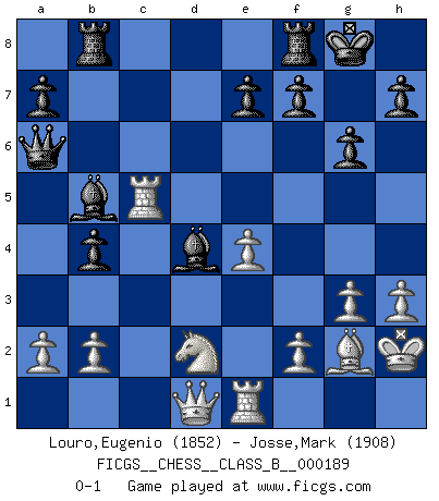Last move : 0-1 2013 May 25 2:40:23 [Event "FICGS__CHESS__CLASS_B__000189"] [Site "FICGS"] [Date "2013.05.05"] [Round "1"] [White "Louro,Eugenio"] [Black "Josse,Mark"] [Result "0-1"] [WhiteElo "1852"] [BlackElo "1908"] 1.e4 c5 2.g3 Nc6 3.Bg2 g6 4.d3 Bg7 5.Ne2 d6 6.O-O Nf6 7.c3 O-O 8.h3 Bd7 9.Be3 b5 10.d4 cxd4 11.Nxd4 Qc8 12.Kh2 Rb8 13.Nd2 b4 14.Rc1 Qa6 15.Nxc6 Bxc6 16.c4 Nd7 17.c5 Nxc5 18.Bxc5 dxc5 19.Rxc5 Bb5 20.Re1 Bd4 0-1 Sicilian : Steinitz variation Kingside Castling by player White (move 6) Kingside Castling by player Black (move 7) Player Black won this chess game. Follow this game move after move (download)A man that will take back a move at Chess will pick a pocket. (Richard Fenton) Als ich elf wurde, wurde ich einfach gut. (Robert James Fischer) Robert Fischer es la ley hacia si mismo. (Larry Evans) Comme les marins qui ont mille raisons différentes d'aller en mer, les joueurs d'échecs en ont tout autant avant de s'installer devant une table et jouer... (Vincent Bertignac, philosophe) Wisdom begins at the end. (Daniel Webster)