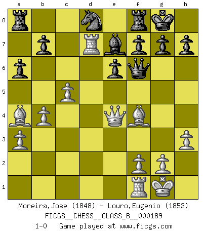 Last move : 1-0 2013 May 15 0:42:24 [Event "FICGS__CHESS__CLASS_B__000189"] [Site "FICGS"] [Date "2013.05.05"] [Round "1"] [White "Moreira,Jose"] [Black "Louro,Eugenio"] [Result "1-0"] [WhiteElo "1848"] [BlackElo "1852"] 1.e4 c6 2.d4 d5 3.e5 c5 4.Nf3 Bg4 5.dxc5 e6 6.Bb5+ Nc6 7.b4 Nge7 8.Nbd2 a6 9.Ba4 Qc7 10.h3 Bxf3 11.Nxf3 Ng6 12.a3 Ngxe5 13.Bf4 Nxf3+ 14.Qxf3 Qc8 15.c4 dxc4 16.Qc3 Qd8 17.Rd1 Qf6 18.Qxc4 Be7 19.O-O O-O 20.Rd7 Nd8 21.Qe4 1-0 Caro-Kann : Advance variation Kingside Castling by player White (move 19) Kingside Castling by player Black (move 19) Player White won this chess game. Follow this game move after move (download)I had a toothache during the first game. In the second game I had a headache. In the third game it was an attack of rheumatism. In the fourth game, I wasn't feeling well. And in the fifth game? Well, must one have to win every game ? (Siegbert Tarrasch) Wenn Du absolut nicht mehr weißt, was Du tun sollst, dann ist es Zeit für Panik. (John van der Wiel) ¿Porque tengo que perder ante este idiota?. (Aron Nimzovich) Si le désir cupide (et stupide) de gagner est une inépuisable source de souffrance, une combinaison brillante sur l'échiquier est une découverte : le coquelicot qui s'épanouit lorsque apparaît la Voie Lactée. (Arrabal) It's unlucky to be superstitious. (Dave Enteles)