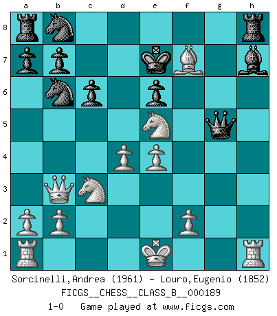 Last move : 1-0 2013 May 27 19:50:50 [Event "FICGS__CHESS__CLASS_B__000189"] [Site "FICGS"] [Date "2013.05.05"] [Round "1"] [White "Sorcinelli,Andrea"] [Black "Louro,Eugenio"] [Result "1-0"] [WhiteElo "1961"] [BlackElo "1852"] 1.d4 d5 2.Nf3 Nf6 3.c4 c6 4.cxd5 Nxd5 5.e4 Nb6 6.Nc3 Bg4 7.Be3 e6 8.h3 Bh5 9.Be2 Be7 10.g4 Bg6 11.h4 h6 12.Ne5 Bh7 13.g5 hxg5 14.hxg5 Bxg5 15.Bh5 g6 16.Bxg6 Qf6 17.Bxf7+ Ke7 18.Bxg5 Qxg5 19.Qb3 1-0 Queen's pawn game Player White won this chess game. Follow this game move after move (download)In life, as in Chess, one's own Pawns block one's way. A man's very wealth, ease, leisure, children, books, which should help him to win, more often checkmate him. (Charles Buxton) Es gibt Leute, die glauben, alles wäre vernünftig, was man mit einem ernsthaften Gesicht tut. (Georg Christoph Lichtenberg) Cuando tengas duda... ¡juega al Ajedrez!. (Tevis) La vie est comme un jeu d'échecs : nous esquissons un plan, mais celui-ci est tributaire de ce que daignent faire l'adversaire aux échecs et le destin dans la vie. (Arthur Schopenhauer) I just play for fun. (Anna Kournikova)