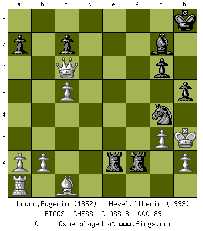 Last move : 0-1 2013 December 4 8:33:51 [Event "FICGS__CHESS__CLASS_B__000189"] [Site "FICGS"] [Date "2013.05.05"] [Round "1"] [White "Louro,Eugenio"] [Black "Mevel,Alberic"] [Result "0-1"] [WhiteElo "1852"] [BlackElo "1993"] 1.d4 f5 2.c4 Nf6 3.Nc3 g6 4.Nf3 Bg7 5.Qc2 O-O 6.g3 d6 7.Bg2 Qe8 8.O-O e5 9.dxe5 dxe5 10.e4 Nc6 11.exf5 Bxf5 12.Qb3 e4 13.Re1 exf3 14.Rxe8 Raxe8 15.Bxf3 Re1+ 16.Kg2 Bd3 17.c5 Kh8 18.Ne2 Bxe2 19.Bxe2 Rxe2 20.Qxb7 Ng4 21.Qxc6 R8xf2+ 22.Kh3 h5 0-1 This chess game has been lost on time (started : 2013.05.05 11:51:21) Dutch with c4 & Nc3 Kingside Castling by player Black (move 5) Kingside Castling by player White (move 8) Player Black won this chess game. Follow this game move after move (download)If Chess is a science, it's a most inexact one. If Chess is an art, it is too exacting to be seen as one. If Chess is a sport, it's too esoteric. If Chess is a game, it's too demanding to be just a game. If Chess is a mistress, she's a demanding one. If Chess is a passion, it's a rewarding one. If Chess is life, it's a sad one. (Unknown) Der Freibauer hat für mich eine Seele, genau wie der Mensch, Wünsche, die unerkannt in ihm schlummern, und Befürchtungen, von deren Existenz er selbst kaum ahnt. (Aaron Nimzowitsch) No puedes jugar al Ajedrez si eres de corazón noble. (Proverbio Francés) Aidez vos pièces, elles vous aideront. (Paul Morphy) There are two kinds of tragedy in this world, one is not getting what you want and the other is getting. (Lord of war)