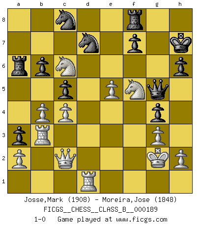 Last move : 1-0 2013 May 30 23:58:39 [Event "FICGS__CHESS__CLASS_B__000189"] [Site "FICGS"] [Date "2013.05.05"] [Round "1"] [White "Josse,Mark"] [Black "Moreira,Jose"] [Result "1-0"] [WhiteElo "1908"] [BlackElo "1848"] 1.d4 Nf6 2.c4 e6 3.Nf3 b6 4.g3 Bb7 5.Bg2 Bb4+ 6.Bd2 Qe7 7.O-O Bxd2 8.Qxd2 a5 9.Nc3 O-O 10.Rfe1 d6 11.e4 Nfd7 12.Nh4 Nc6 13.f4 a4 14.Rac1 a3 15.b3 Na7 16.b4 Rfe8 17.Rb1 h6 18.Rb3 g5 19.Nf3 g4 20.Nh4 Nc8 21.Nb5 Qd8 22.d5 Ra6 23.dxe6 Rxe6 24.Nd4 Re8 25.Nhf5 Kh7 26.Qc2 Rf8 27.e5 Bxg2 28.Kxg2 dxe5 29.fxe5 c5 30.Nc6 Qg5 31.Rd1 1-0 Queen's Indian : Capablanca variation Kingside Castling by player White (move 7) Kingside Castling by player Black (move 9) Player White won this chess game. Follow this game move after move (download)Chess holds its master in its own bonds, shackling the mind and brain so that the inner freedom of the very strongest must suffer. (Albert Einstein) Kleine Schachspieler machen Mist, und große Schachspieler machen Mist, aber große machen weniger Mist. (Fritz Sämisch) Una clavada es mas poderosa que una espada. (Fred Reinfeld) Vous n'êtes pas toujours obligé de jouer le meilleur coup. Un coup doit être actif, entreprenant, correct et beau ! (David Bronstein) Life is the sum of all your choices. (Albert Camus)