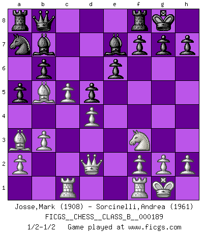 Last move : 1/2-1/2 2013 May 30 1:2:19 [Event "FICGS__CHESS__CLASS_B__000189"] [Site "FICGS"] [Date "2013.05.05"] [Round "1"] [White "Josse,Mark"] [Black "Sorcinelli,Andrea"] [Result "1/2-1/2"] [WhiteElo "1908"] [BlackElo "1961"] 1.d4 d5 2.c4 c6 3.Nf3 Nf6 4.e3 e6 5.b3 c5 6.Bb2 cxd4 7.exd4 Nc6 8.Bd3 Bb4+ 9.Nbd2 Ne4 10.O-O Nxd2 11.Nxd2 O-O 12.Nf3 Be7 13.Qd2 b6 14.Rac1 Bb7 15.c5 a5 16.Bb5 Na7 17.Be2 Nc6 18.Bb5 Na7 19.Be2 Nc6 20.Ba3 Qb8 21.Bb5 Na7 1/2-1/2 QGD Slav : 4.e3 Kingside Castling by player White (move 10) Kingside Castling by player Black (move 11) This chess game ended in a draw. Follow this game move after move (download)You cannot play at Chess if you are kind-hearted. (French Proverb) Ich war schon mal beim Dopingtest. Da musste ich Urin abgeben, während Dritte zusahen. (Elisabeth Pähtz) Fischer deseaba darle a los Rusos una sopa de su propia medicina. (Larry Evans) Le moment que je préfère le plus dans une rencontre, c'est celui où je sens que la personnalité de l'adversaire se brise. (Robert Fischer) The only difference between a tax man and a taxidermist is that the taxidermist leaves the skin. (Mark Twain)