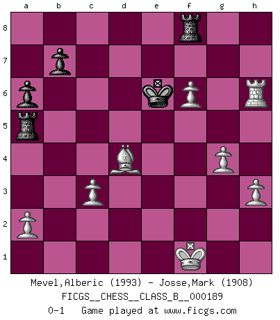 Last move : 0-1 2013 December 18 9:41:13 [Event "FICGS__CHESS__CLASS_B__000189"] [Site "FICGS"] [Date "2013.05.05"] [Round "1"] [White "Mevel,Alberic"] [Black "Josse,Mark"] [Result "0-1"] [WhiteElo "1993"] [BlackElo "1908"] 1.e4 c5 2.Nf3 d6 3.d4 cxd4 4.Nxd4 Nf6 5.Nc3 a6 6.Bc4 e6 7.Bb3 Nbd7 8.f4 Nc5 9.O-O Ncxe4 10.Nxe4 Nxe4 11.f5 e5 12.Qh5 d5 13.Re1 Bc5 14.Rxe4 Bxd4+ 15.Be3 O-O 16.Rxd4 exd4 17.Bxd4 Re8 18.Rd1 Qd6 19.Bc3 Qb6+ 20.Bd4 Qh6 21.Qxh6 gxh6 22.Rf1 Re4 23.c3 Re2 24.Rf3 Rxb2 25.h3 Kf8 26.Bxd5 Ke7 27.f6+ Kd6 28.Bxf7 Be6 29.Bxe6 Kxe6 30.Re3+ Kd6 31.Re7 Rg8 32.Kf1 Rb5 33.g4 Rf8 34.Rxh7 Ra5 35.Rxh6 Ke6 0-1 This chess game has been lost on time (started : 2013.05.05 11:51:21) Sicilian : Najdorf, Lipnitzky attack Kingside Castling by player White (move 9) Kingside Castling by player Black (move 15) Player Black won this chess game. Follow this game move after move (download)I'm not a materialistic person, in that, I don't suffer the lack or loss of money. The absence of worldly goods I don't look back on. For Chess is a way I can be as materialistic as I want without having to sell my soul. (Jamie Walter Adams) Wie ich sie so einen nach dem anderen nieder mähte wurde meine Überlegenheit offensichtlich. (José Raúl Capablanca) El Ajedrez es la vida. (Bobby Fischer) Des points faibles ou des trous dans la position de l'adversaire doivent être occupés par des pièces et non pas par des pions. (Siegbert Tarrasch) Internal peace cannot coexist with external war. (Don Groves)