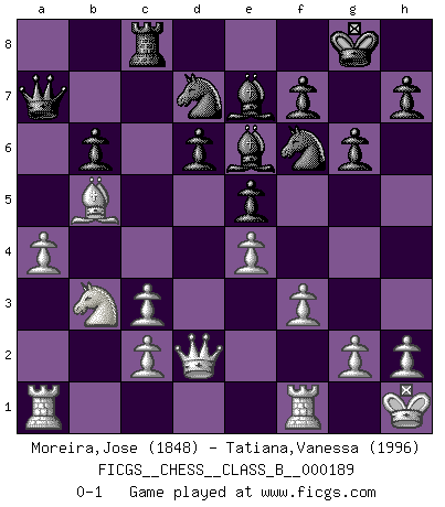Last move : 0-1 2013 May 24 12:11:29 [Event "FICGS__CHESS__CLASS_B__000189"] [Site "FICGS"] [Date "2013.05.05"] [Round "1"] [White "Moreira,Jose"] [Black "Tatiana,Vanessa"] [Result "0-1"] [WhiteElo "1848"] [BlackElo "1996"] 1.e4 c5 2.Nf3 d6 3.d4 cxd4 4.Nxd4 Nf6 5.Nc3 g6 6.Be3 e5 7.Nb3 Be6 8.Be2 Nbd7 9.O-O Rc8 10.f3 Be7 11.Bxa7 Rxc3 12.bxc3 b6 13.a4 Qc7 14.Qd2 Qxa7 15.Kh1 O-O 16.Bb5 Rc8 0-1 Sicilian : Dragon, 6.Be3 Kingside Castling by player White (move 9) Kingside Castling by player Black (move 15) Player Black won this chess game. Follow this game move after move (download)Some sacrifices are sound; the rest are mine. (Mikhail Tal) Sie führen leise Selbstgespräche, schlürfen lautstark ihre Getränke, schmatzen hörbar beim Essen, blasen ihrem Gegenüber Rauch in die Augen, niesen ihm ins Gesicht, starren ihn unverwandt an, bis er sich unter ihren Blicken windet, rutschen ständig auf ihrem Stuhl hin und her, rülpsen und bohren in der Nase. (Anonymous) El Ajedrez por encima de todo... ¡es una pelea!. (Emanuel Lasker) Les Echecs sont affaire de jugement sensible. Savoir quand frapper et quand esquiver. (Fischer) If things go wrong, don't go with them. (Roger Babson)