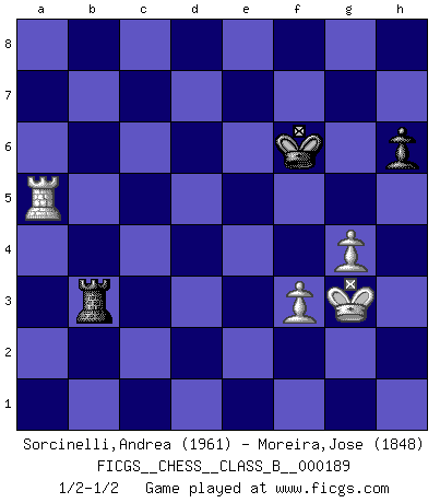 Last move : 1/2-1/2 2013 June 25 2:44:3 [Event "FICGS__CHESS__CLASS_B__000189"] [Site "FICGS"] [Date "2013.05.05"] [Round "1"] [White "Sorcinelli,Andrea"] [Black "Moreira,Jose"] [Result "1/2-1/2"] [WhiteElo "1961"] [BlackElo "1848"] 1.d4 Nf6 2.Bg5 e6 3.e3 Be7 4.Bd3 O-O 5.Nf3 c5 6.c3 Qb6 7.Qc2 h6 8.Bh4 Nc6 9.O-O d5 10.Nbd2 c4 11.Be2 Bd7 12.b3 cxb3 13.axb3 Rfd8 14.Ne5 Be8 15.Nxc6 Bxc6 16.Nf3 Rdc8 17.Ne5 Qc7 18.c4 a5 19.Rfc1 dxc4 20.Nxc6 bxc6 21.Qxc4 Qd8 22.Bf3 Nd5 23.Bxe7 Qxe7 24.Qa4 Qe8 25.Rc5 Nb6 26.Qa2 a4 27.Rac1 axb3 28.Qxb3 Nd5 29.h3 Rab8 30.Qc4 Rb4 31.Qc2 Ne7 32.Bxc6 Rxc6 33.Rxc6 Qxc6 34.Qxc6 Nxc6 35.Rxc6 g5 36.Rc2 Rb1+ 37.Kh2 Kg7 38.g4 Kg6 39.Rc7 Rb6 40.Kg3 Rb2 41.Rc5 Re2 42.d5 exd5 43.Rxd5 f6 44.h4 gxh4+ 45.Kf3 Re1 46.e4 Rh1 47.Kg2 Rc1 48.f3 Rb1 49.Rh5 Rb2+ 50.Kh3 Rb1 51.Rc5 Rh1+ 52.Kg2 Re1 53.Rb5 Rc1 54.Rh5 Rc2+ 55.Kh3 Rc3 56.Rf5 Kg7 57.Kxh4 Ra3 58.Kg3 Kg6 59.Kf4 Rc3 60.Ra5 Rb3 61.e5 fxe5+ 62.Rxe5 Rb6 63.Kg3 Rb3 64.Ra5 Kf6 65.Ra6+ Kg5 66.Ra5+ Kf6 67.Ra6+ Kg5 68.Ra5+ Kf6 1/2-1/2 Trompowsky attack (Ruth, Opovcensky Opening) Kingside Castling by player Black (move 4) Kingside Castling by player White (move 9) 10 pieces endgame at move 44 : White KRPPP , Black KRPPP WHITE : King + 1 Rook 3 Pawns BLACK : King + 1 Rook 3 Pawns 9 pieces endgame at move 57 : White KRPPP , Black KRPP WHITE : King + 1 Rook 3 Pawns BLACK : King + 1 Rook 2 Pawns 8 pieces endgame at move 61 : White KRPP , Black KRPP WHITE : King + 1 Rook 2 Pawns BLACK : King + 1 Rook 2 Pawns 7 pieces endgame at move 62 : White KRPP , Black KRP WHITE : King + 1 Rook 2 Pawns BLACK : King + 1 Rook 1 Pawn This chess game ended in a draw. Follow this game move after move (download)Chess, like any creative activity, can exist only through the combined efforts of those who have creative talent, and those who have the ability to organize their creative work. (Mikhail Botvinnik) Ein Buch ist ein Spiegel; wenn ein Affe hineinsieht, so kann kein Apostel heraus gucken. (Georg Christoph Lichtenberg) Un Peón pasado aumenta su poder a medida de que el número de piezas en el tablero disminuye. (Capablanca) La tactique, c'est ce que vous faites quand il y a quelque chose à faire; la stratégie, c'est ce que vous faites quand il n'y a rien à faire. (Savielli Tartacower) At work, the authority of a person is inversely proportional to the number of pens that person is carrying. (Dan Rotaru)