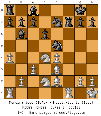 Last move : 1-0 2013 August 6 7:29:58 [Event "FICGS__CHESS__CLASS_B__000189"] [Site "FICGS"] [Date "2013.05.05"] [Round "1"] [White "Moreira,Jose"] [Black "Mevel,Alberic"] [Result "1-0"] [WhiteElo "1848"] [BlackElo "1993"] 1.e4 e5 2.Nf3 Nc6 3.d4 exd4 4.Nxd4 Bc5 5.Be3 Qf6 6.c3 Nge7 7.Bc4 Ne5 8.Be2 Qg6 9.O-O d6 10.f3 O-O 11.Kh1 f5 12.Nd2 Bb6 13.a4 fxe4 14.Qb3+ Qf7 15.Qxf7+ Rxf7 16.fxe4 1-0 This chess game has been lost on time (started : 2013.05.05 11:51:21) Scotch game Kingside Castling by player White (move 9) Kingside Castling by player Black (move 10) Player White won this chess game. Follow this game move after move (download)Nothing excites jaded Grandmasters more than a theoretical novelty. (Dominic Lawson) Ich tröste mich mit dem Vergnügen, daß Schachfans, Zuschauer und Leser glücklich sind, wenn ein Großmeister etwas riskiert, statt nur Klötzchen zu schieben. (Mikhail Nekhemyevich Tal) La caracteristica mas importante en la posición del Ajedrez es la actividad de las piezas. Esto es absolutamente fundamental en todas las fases del juego: Apertura, Juego Medio y especialmente Finales. La limitación primordial en la actividad de una pieza, es la estructuración de los Peones. (Michael Stean) Il n'y a pas de prix trop élevé au scalp de l'ennemi. (Koblentz) I'm extremely disappointed. I send you out for exciting, new designer drugs, you come back with tomato sauce. (Gregory House, House M.D.)