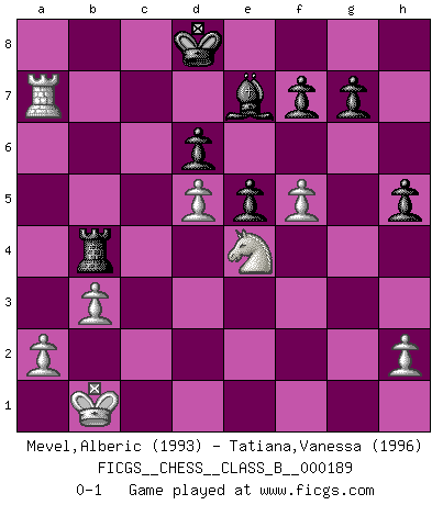 Last move : 0-1 2013 November 2 2:15:34 [Event "FICGS__CHESS__CLASS_B__000189"] [Site "FICGS"] [Date "2013.05.05"] [Round "1"] [White "Mevel,Alberic"] [Black "Tatiana,Vanessa"] [Result "0-1"] [WhiteElo "1993"] [BlackElo "1996"] 1.e4 c5 2.Nf3 d6 3.d4 cxd4 4.Nxd4 Nf6 5.Nc3 a6 6.Be3 e5 7.Nb3 Be6 8.Qd2 Nbd7 9.O-O-O Be7 10.f4 b5 11.f5 Bc4 12.g4 Nxg4 13.Rg1 Ndf6 14.Kb1 Bxf1 15.Rdxf1 Nxe3 16.Qxe3 b4 17.Nd5 Nxd5 18.exd5 Bf6 19.Nd2 h5 20.Ne4 a5 21.c4 bxc3 22.Rc1 Rc8 23.Rxc3 Rxc3 24.Qxc3 Qb6 25.Rc1 Kd7 26.Qc6+ Qxc6 27.Rxc6 Be7 28.Ra6 Rc8 29.b3 Rb8 30.Rxa5 Rb4 31.Ra7+ Kd8 0-1 This chess game has been lost on time (started : 2013.05.05 11:51:21) Sicilian : Najdorf, Byrne (English) attack Queenside Castling by player White (move 9) Player Black won this chess game. Follow this game move after move (download)Do you realize Fischer almost never has any bad pieces? He exchanges them, and the bad pieces remain with his opponents. (Yuri Balashov) Wenn Spassky eine Figur opfert kannst du genauso gut aufgeben. Aber wenn Tal eine Figur opfert, spiel weiter. Er könnte noch eine weitere opfern, und dann ... wer weiß? (Miguel Najdorf) Todavía soy una víctima del Ajedrez. Tiene toda la belleza del arte y mucho mas. No puede ser comercializado. El Ajedrez es mas puro que el arte en su posición social. (Marcel Duchamp) On n'a jamais que l'âge auquel on a commence à jouer aux échecs car après on cesse de vieillir. (Capablanca) Heh, heh, heh. Time to abandon ship. (General Grievous in Star Wars ep.3)