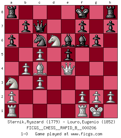 Last move : 1-0 2013 May 27 20:17:24 [Event "FICGS__CHESS__RAPID_B__000206"] [Site "FICGS"] [Date "2013.05.08"] [Round "1"] [White "Sternik,Ryszard"] [Black "Louro,Eugenio"] [Result "1-0"] [WhiteElo "1779"] [BlackElo "1852"] 1.e4 c6 2.d4 d5 3.e5 c5 4.c3 Nc6 5.Ne2 Bf5 6.dxc5 Nxe5 7.Nd4 Bd7 8.Bf4 Nc6 9.Be2 Nf6 10.O-O e6 11.b4 g6 12.Nb5 e5 13.Bg5 Be7 14.Bxf6 Bxf6 15.Nd6+ Kf8 16.Qxd5 Be6 17.Qe4 Qc7 18.Na3 a6 19.Bc4 1-0 Caro-Kann : Advance variation Kingside Castling by player White (move 10) Player White won this chess game. Follow this game move after move (download)When the Chess game is over, the Pawn and the King go back to the same box. (Irish saying) Früher wurde jeder komplizierte Zug, jedes interessante Opfer mit großem Beifall und Enthusiasmus aufgenommen. Heute schaltet man einfach seinen Fritz an, und man kann sehen, was los ist, ob der Zug geht oder nicht. (Vladimir Kramnik) El muchacho (en ese entonces un niño de 12 años llamado Anatoly Karpov) no tiene ni idea de lo que es el Ajedrez y no hay futuro en absoluto para el en esta profesión. (Mikhail Botvinnik) Les Echecs mettent en conflit, non pas deux intelligences, mais deux volontés. (Lasker) Memory... is the diary that we all carry with us. (Oscar Wilde, The Importance of Being Earnest)