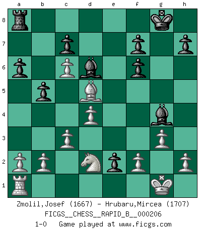 Last move : 1-0 2013 August 10 17:57:20 [Event "FICGS__CHESS__RAPID_B__000206"] [Site "FICGS"] [Date "2013.05.08"] [Round "1"] [White "Zmolil,Josef"] [Black "Hrubaru,Mircea"] [Result "1-0"] [WhiteElo "1667"] [BlackElo "1707"] 1.e4 e5 2.Nf3 Nc6 3.Bb5 a6 4.Ba4 Nf6 5.O-O Be7 6.Re1 b5 7.Bb3 O-O 8.c3 d5 9.exd5 e4 10.dxc6 exf3 11.g3 Bg4 12.d4 Bd6 13.Bg5 Re8 14.Rxe8+ Qxe8 15.Bxf6 gxf6 16.Bd5 Qe2 17.Qxe2 fxe2 18.Nd2 1-0 This chess game has been lost on time (started : 2013.05.08 15:23:8) Ruy Lopez : Closed, 7...O-O Kingside Castling by player White (move 5) Kingside Castling by player Black (move 7) Player White won this chess game. Follow this game move after move (download)The blunders are all there on the board, waiting to be made. (Savielly Tartakover) Kombinieren und Schwarzhandel gehören verboten. (Savielly Grigorievitsch Tartakower) Una compensación adecuada por un sacrificio es tener una combinación sólida que conduce a una posición ganadora; una compensación adecuada por una metida de pata es dejar a tu oponente arrebatar una derrota de las fauces de la victoria. (Bruce A. Moon) La tactique est l'élément le plus important du milieu de jeu. (Siegbert Tarrasch) A person who never made a mistake never tried anything new. (Albert Einstein)