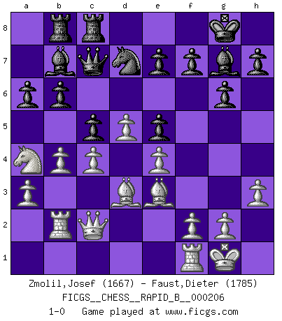 Last move : 1-0 2013 July 7 11:13:49 [Event "FICGS__CHESS__RAPID_B__000206"] [Site "FICGS"] [Date "2013.05.08"] [Round "1"] [White "Zmolil,Josef"] [Black "Faust,Dieter"] [Result "1-0"] [WhiteElo "1667"] [BlackElo "1785"] 1.d4 Nf6 2.c4 c5 3.d5 d6 4.Nc3 a6 5.e4 g6 6.Nf3 Bg7 7.h3 Nbd7 8.Bd3 Ne5 9.Nxe5 dxe5 10.Be3 b6 11.a3 O-O 12.b4 Nd7 13.O-O Bb7 14.Rb1 Rb8 15.Na4 Qc7 16.Qc2 Rfc8 17.Rb2 1-0 Benoni defense, Hromodka system Kingside Castling by player Black (move 11) Kingside Castling by player White (move 13) Player White won this chess game. Follow this game move after move (download)It's just you and your opponent at the board and you're trying to prove something. (Bobby Fischer) Alles was ich jemals tun will ist Schach spielen. (Robert James Fischer) A través de las casillas del tablero, los Indios explican el movimiento del tiempo y la edad, las influencias mas altas que controlan el mundo y los lazos que vinculan al Ajedrez con el alma humana. (Al-Masudi) La solitude du joueur d'Echecs à l'approche du mat est semblable à celle du condamné. (Francis Szpiner) All men can see these tactics whereby I conquer, but what none can see is the strategy out of which victory is evolved. (Sun Tzu)