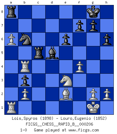 Last move : 1-0 2013 July 3 23:17:41 [Event "FICGS__CHESS__RAPID_B__000206"] [Site "FICGS"] [Date "2013.05.08"] [Round "1"] [White "Lois,Spyros"] [Black "Louro,Eugenio"] [Result "1-0"] [WhiteElo "1898"] [BlackElo "1852"] 1.e4 c6 2.d4 d5 3.Nc3 dxe4 4.Nxe4 Nd7 5.Nf3 Ngf6 6.Neg5 h6 7.Nh3 e6 8.Be2 Bd6 9.Bf4 Bxf4 10.Nxf4 Qc7 11.Nd3 O-O 12.O-O c5 13.c3 b6 14.Qa4 Bb7 15.Rad1 a6 16.Rfe1 b5 17.Qa3 c4 18.Nde5 Nxe5 19.Nxe5 Rfe8 20.Rd2 Nd7 21.f4 a5 22.Bd1 Nf6 23.Qc5 Qxc5 24.dxc5 Bd5 25.c6 Rac8 26.a4 b4 27.cxb4 axb4 28.Rd4 b3 29.Be2 Bxc6 30.a5 Bd5 31.Nxc4 Rc5 32.Ra1 Ra8 33.a6 Nd7 34.Ne3 Nb6 35.Rb4 1-0 Caro-Kann : Steinitz variation Kingside Castling by player Black (move 11) Kingside Castling by player White (move 12) Player White won this chess game. Follow this game move after move (download)We don't really know how the game was invented, though there are suspicions. As soon as we discover the culprits, we'll let you know. (Bruce Pandolfini) Es hat in meinem Leben Zeiten gegeben, da ich sehr nahe daran war zu glauben, daß ich auch nicht eine einzige Schachpartie verlieren könnte. (José Raúl Capablanca) Estaba muy claro de que el punto vulnerable del Gran Maestro Americano (Bobby Fischer) radicaba en las posiciones de doble filo, colgantes, irracionales, donde el siempre falló en encontrar un triunfo aún en una posición de clara victoria. (Efim Geller) Le temps de noter son nom sur la feuille de partie, j'étais déjà en zeitnot ! D'un modeste amateur apparié lors de la première ronde d'un open contre le grand-maître Azmaïparashvili. I have opinions of my own - strong opinions - but I don't always agree with them. (George Bush)