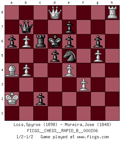 Last move : 1/2-1/2 2013 July 3 17:6:14 [Event "FICGS__CHESS__RAPID_B__000206"] [Site "FICGS"] [Date "2013.05.08"] [Round "1"] [White "Lois,Spyros"] [Black "Moreira,Jose"] [Result "1/2-1/2"] [WhiteElo "1898"] [BlackElo "1848"] 1.e4 c5 2.Nf3 d6 3.d4 cxd4 4.Nxd4 Nf6 5.Nc3 g6 6.Be3 Bg7 7.Bc4 Nc6 8.f3 Qb6 9.Bb5 Qc7 10.g4 Bd7 11.Qd2 Rc8 12.Be2 a6 13.h4 h6 14.O-O-O b5 15.a3 Ne5 16.g5 hxg5 17.hxg5 Rxh1 18.Rxh1 Nh5 19.Nd5 Qb7 20.b3 Be6 21.Nb6 Rc7 22.Rg1 Nc6 23.Nxe6 fxe6 24.Kb1 Ne5 25.a4 Nf4 26.Bxf4 Qxb6 27.Be3 Qc6 28.a5 Nd7 29.Rh1 Rc8 30.Bf2 Bc3 31.Qf4 Ne5 32.Bb6 Bb4 33.c4 bxc4 34.Rh7 Qb7 35.Bd1 c3 36.Bc2 Bc5 37.b4 Bxb6 38.Ba4+ Rc6 39.Rh8+ Kd7 40.Qf8 c2+ 41.Ka2 d5 42.axb6 Kd6 43.Qd8+ 1/2-1/2 Sicilian : Dragon, 6.Be3 Queenside Castling by player White (move 14) This chess game ended in a draw. Follow this game move after move (download)There are tough players and nice guys, and I'm a tough player. (Bobby Fischer) Wenn du nicht weißt was du tun sollst, warte bis dein Gegner eine Idee hat. Sie wird sicher schlecht sein. (Siegbert Tarrasch) El Ajedrez es un invernadero donde los frutos del carácter pueden madurar mas completamente que en la vida. (Edward Morgan Foster) La tactique, c'est ce que vous faites quand il y a quelque chose à faire; la stratégie, c'est ce que vous faites quand il n'y a rien à faire. (Savielli Tartacower) Chess, like love, like music, has the power to make people happy. (Siegbert Tarrasch)