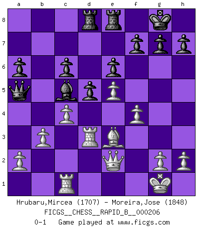 Last move : 0-1 2013 July 7 7:9:29 [Event "FICGS__CHESS__RAPID_B__000206"] [Site "FICGS"] [Date "2013.05.08"] [Round "1"] [White "Hrubaru,Mircea"] [Black "Moreira,Jose"] [Result "0-1"] [WhiteElo "1707"] [BlackElo "1848"] 1.e4 c5 2.Nf3 d6 3.Bb5+ Bd7 4.Bxd7+ Qxd7 5.c4 e6 6.O-O Nf6 7.Nc3 a6 8.d4 cxd4 9.Nxd4 Be7 10.Qe2 O-O 11.f4 Nc6 12.Be3 Qc7 13.b3 Rfe8 14.Rad1 Qa5 15.Nxc6 bxc6 16.Bd2 Qc7 17.Be3 Qa5 18.Rd3 d5 19.e5 Nd7 20.Na4 Rad8 21.Rc1 Nc5 22.Nxc5 Bxc5 0-1 Sicilian : Canal-Sokolsky attack, Sokolsky variation Kingside Castling by player White (move 6) Kingside Castling by player Black (move 10) Player Black won this chess game. Follow this game move after move (download)The older I grow, the more I value pawns. (Paul Keres) Auf jeden Fall musst du zuerst Rechtsanwalt werden, damit du deine eigenen Interessen und die deiner Familie vertreten kannst. [Brief an seinen Sohn] (José Raúl Capablanca) No todos los artistas son jugadores de Ajedrez, pero todos los jugadores de Ajedrez son artistas. (Marcel Duchamp) Si rien de grave n'est détecté lors de l'analyse d'une position, on joue alors le coup. Seconde règle de Blumenfeld. Convictions are more dangerous enemies of truth than lies. (Friedrich Nietzsche)