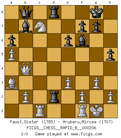 Last move : 1-0 2013 July 27 12:41:56 [Event "FICGS__CHESS__RAPID_B__000206"] [Site "FICGS"] [Date "2013.05.08"] [Round "1"] [White "Faust,Dieter"] [Black "Hrubaru,Mircea"] [Result "1-0"] [WhiteElo "1785"] [BlackElo "1707"] 1.d4 d5 2.c4 c6 3.Nf3 Nf6 4.Nc3 e6 5.e3 Nbd7 6.Ne5 Bb4 7.Bd2 O-O 8.Be2 dxc4 9.Nxc4 b5 10.Ne5 Bb7 11.O-O Be7 12.Nd3 c5 13.Nxb5 Ne4 14.dxc5 Ndxc5 15.Bb4 Qb6 16.Nxc5 Nxc5 17.Qd4 Rfd8 18.Qf4 Bf6 19.a4 Nd3 20.Bxd3 Rxd3 21.Rac1 a6 22.Nc7 Rad8 23.a5 Qa7 24.Qc4 Qb8 25.g3 h5 26.Ba3 Rd2 27.Qb4 1-0 QGD Slav : 4.Nc3 Kingside Castling by player Black (move 7) Kingside Castling by player White (move 11) Player White won this chess game. Follow this game move after move (download)There are two types of sacrifices: correct ones and mine. (Mikhail Tal) Das Schachspiel übertrifft alle anderen Spiele so weit wie der Chimborasso einen Misthaufen. (Arthur Schopenhauer) Siempre es mejor sacrificar los hombres de tu oponente. (Savielly Tartakower) Je menace de comprendre la position. (Anonyme) Perhaps chess is the wrong game for the times (The Chess Master and the Computer, by Garry Kasparov - 2010)