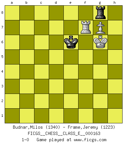 Last move : 1-0 2013 July 30 18:11:21 [Event "FICGS__CHESS__CLASS_E__000163"] [Site "FICGS"] [Date "2013.05.10"] [Round "1"] [White "Budnar,Milos"] [Black "Frame,Jeremy"] [Result "1-0"] [WhiteElo "1340"] [BlackElo "1223"] 1.e4 e5 2.Nf3 Nf6 3.Bc4 Nc6 4.Ng5 d5 5.exd5 Nxd5 6.d4 Nxd4 7.c3 Nc6 8.Bxd5 Be6 9.Nxe6 fxe6 10.Bxc6+ bxc6 11.Qh5+ g6 12.Qxe5 Rg8 13.O-O Qe7 14.Bg5 Qd6 15.Bf4 Qxe5 16.Bxe5 Bd6 17.Bxd6 cxd6 18.b4 Rf8 19.a3 Ke7 20.Nd2 Rf5 21.Ne4 Rb8 22.Rab1 Rfb5 23.Rfd1 d5 24.Nc5 a5 25.f4 axb4 26.axb4 d4 27.cxd4 Kd6 28.Ne4+ Ke7 29.h4 Rxb4 30.Rxb4 Rxb4 31.Ng5 h6 32.Nh3 Kd6 33.g4 Kd5 34.h5 gxh5 35.g5 hxg5 36.fxg5 Rb3 37.Kg2 h4 38.Rd2 Rg3+ 39.Kh2 Ke4 40.Rg2 Rf3 41.Rg4+ Kd5 42.Rxh4 Rf8 43.Rf4 Rg8 44.Kg3 e5 45.dxe5 Kxe5 46.Kg4 c5 47.Rf5+ Kd4 48.Ng1 c4 49.Rf6 Kd3 50.g6 c3 51.Re6 Kc2 52.Ne2 Kb2 53.Nxc3 Kxc3 54.Kg5 Kd4 55.Re7 Kd5 56.g7 Kd6 57.Rf7 Ke6 58.Kg6 1-0 Petrov : Italian variation Kingside Castling by player White (move 13) 10 pieces endgame at move 36 : White KRNPP , Black KRPPP WHITE : King + 1 Rook 1 Knight 2 Pawns BLACK : King + 1 Rook 3 Pawns 9 pieces endgame at move 42 : White KRNPP , Black KRPP WHITE : King + 1 Rook 1 Knight 2 Pawns BLACK : King + 1 Rook 2 Pawns 8 pieces endgame at move 45 : White KRNPP , Black KRP WHITE : King + 1 Rook 1 Knight 2 Pawns BLACK : King + 1 Rook 1 Pawn 7 pieces endgame at move 45 : White KRNP , Black KRP WHITE : King + 1 Rook 1 Knight 1 Pawn BLACK : King + 1 Rook 1 Pawn 6 pieces endgame at move 53 : White KRNP , Black KR WHITE : King + 1 Rook 1 Knight 1 Pawn BLACK : King + 1 Rook 5 pieces endgame at move 53 : White KRP , Black KR WHITE : King + 1 Rook 1 Pawn BLACK : King + 1 Rook Player White won this chess game. Follow this game move after move (download)A Chess game is a dialogue, a conversation between a player and his opponent. Each move by the opponent may contain threats or be a blunder, but a player cannot defend against threats or take advantage of blunders if he does not first ask himself: What is my opponent planning after each move ? (Bruce A. Moon) Ich organisiere ein großes Turnier, was mich etwa 120000 Dollar kostet. Ich denke, das ist das erste Mal in der Schachgeschichte, daß ein Schachgroßmeister auch als Mäzen auftritt. (Miguel Najdorf) EL Ajedrez es como la vida. (Boris Spassky) Aux échecs, l'amour-propre est satisfait quand on remporte la victoire, mais il n'y a pas de honte à être battu. (Benjamin Franklin) Panic is a sudden desertion of us, an a going over to the enemy of our imagination. (Christian Nevell Bovee)