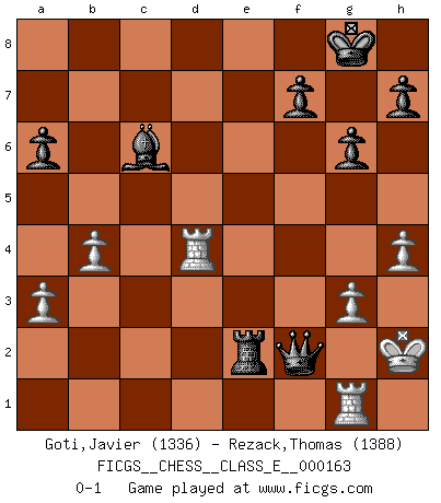 Last move : 0-1 2013 July 16 14:51:5 [Event "FICGS__CHESS__CLASS_E__000163"] [Site "FICGS"] [Date "2013.05.10"] [Round "1"] [White "Goti,Javier"] [Black "Rezack,Thomas"] [Result "0-1"] [WhiteElo "1336"] [BlackElo "1388"] 1.c4 e5 2.Nc3 Nf6 3.g3 Nc6 4.Bg2 d6 5.d3 a6 6.Nf3 Be7 7.O-O O-O 8.a3 Bf5 9.Nd5 Nxd5 10.cxd5 Nb8 11.e4 Bd7 12.h4 c6 13.d4 Bg4 14.Qb3 Qc7 15.dxe5 cxd5 16.exd5 dxe5 17.Nxe5 Qxe5 18.Qxb7 Nd7 19.Qxd7 Bxd7 20.d6 Bxd6 21.Bxa8 Rxa8 22.Bf4 Qe6 23.Bxd6 Qxd6 24.Kh2 Qe6 25.Rh1 Bc6 26.Rhe1 Qd5 27.Rg1 Re8 28.Rad1 Qf3 29.Rd2 g6 30.b4 Bb5 31.Rd4 Re2 32.Rg2 Bc6 33.Rg1 Qxf2+ 0-1 English : Carls' Bremen system Kingside Castling by player White (move 7) Kingside Castling by player Black (move 7) Player Black won this chess game. Follow this game move after move (download)Botvinnik tried to take the mystery out of Chess, always relating it to situations in ordinary life. He used to call Chess a typical inexact problem similar to those which people are always having to solve in everyday life. (Garry Kasparov) Ich könnte leicht behaupten: Ja,ja, Leonid Breschnew wollte nicht, daß ich Weltmeister werde. In der Tat war die Sache komplizierter. (Viktor Kortschnoi) Bobby solo arroja las piezas y solas caen en las casillas correctas. (Miguel Najdorf ) Avant la finale, les dieux ont créé le milieu de partie. (Tarrasch) The worth of a book is to be measured by what you can carry away from it. (James Bryce)
