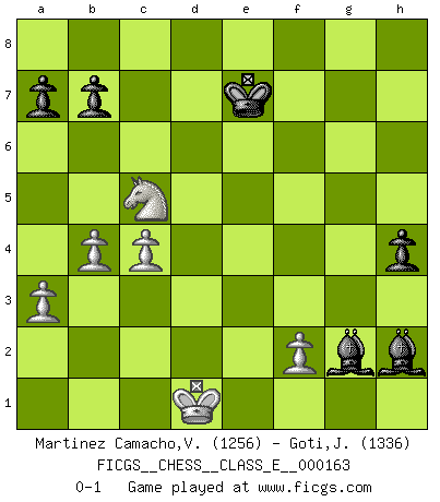 Last move : 0-1 2013 July 22 17:2:17 [Event "FICGS__CHESS__CLASS_E__000163"] [Site "FICGS"] [Date "2013.05.10"] [Round "1"] [White "Martinez Camacho,Victor Hugo"] [Black "Goti,Javier"] [Result "0-1"] [WhiteElo "1256"] [BlackElo "1336"] 1.d4 Nf6 2.c4 g6 3.Nc3 Bg7 4.e4 d6 5.Nf3 O-O 6.Be2 c5 7.dxc5 dxc5 8.Qxd8 Rxd8 9.O-O Nc6 10.Bf4 e5 11.Nxe5 Nd4 12.Bf3 Nxf3+ 13.Nxf3 Bg4 14.Ne5 Be6 15.b3 Nh5 16.g3 Nxf4 17.gxf4 f5 18.Rad1 Bh6 19.Rxd8+ Rxd8 20.exf5 Bxf5 21.Nd5 Kf8 22.a3 g5 23.fxg5 Bxg5 24.Nf3 Bh3 25.Re1 Bh6 26.Rd1 Ke8 27.Nc7+ Ke7 28.Nd5+ Kf8 29.Re1 Rd7 30.Ne5 Rg7+ 31.Kh1 Bg2+ 32.Kg1 Bxd5 33.Kf1 Bg2+ 34.Ke2 Bf4 35.Nd3 Re7+ 36.Kd1 Bxh2 37.Rxe7 Kxe7 38.Nxc5 h5 39.b4 h4 0-1 King's Indian : 6.Be2 Kingside Castling by player Black (move 5) Kingside Castling by player White (move 9) Player Black won this chess game. Follow this game move after move (download)Different people feel differently about resigning. (Bobby Fischer) Ich habe die Schachforschung dermaßen betrieben, dass sie auf eine wissenschaftliche Basis gestellt wurde. (Mikhail Moiseyevich Botvinik) Solo el jugador con la iniciativa tiene el derecho a atacar. (Wilhelm Steinitz) La solitude du joueur d'Echecs à l'approche du mat est semblable à celle du condamné. (Francis Szpiner) Creativity is allowing yourself to make mistakes. Art is knowing which ones to keep. (Scott Adams)