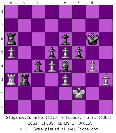 Last move : 0-1 2013 July 22 21:48:14 [Event "FICGS__CHESS__CLASS_E__000163"] [Site "FICGS"] [Date "2013.05.10"] [Round "1"] [White "Stoyanov,Zdravko"] [Black "Rezack,Thomas"] [Result "0-1"] [WhiteElo "1270"] [BlackElo "1388"] 1.e4 d6 2.Nf3 c5 3.h3 Nc6 4.Bb5 Bd7 5.O-O g6 6.Bxc6 Bxc6 7.d3 Bg7 8.Nc3 Nf6 9.Re1 O-O 10.Be3 e6 11.a3 Qe7 12.b4 b6 13.b5 Bb7 14.a4 Nd7 15.Bg5 Qe8 16.Qd2 Qc8 17.Bh6 c4 18.Bxg7 Kxg7 19.d4 d5 20.e5 f5 21.Ng5 Qe8 22.Qf4 Rc8 23.Qh4 Rh8 24.Re3 h6 25.Nf3 g5 26.Nxg5 hxg5 27.Qxg5+ Qg6 28.Qe7+ Kh6 29.Qxd7 Rh7 30.Qd6 Rg8 31.Rg3 Qf7 32.Rf3 Rhg7 33.g3 Bc8 34.Qa3 Qh5 35.Qc1+ Kh7 36.Ne2 Qxf3 37.Qe3 Qxe3 38.fxe3 Bd7 39.c3 Be8 40.Kh2 Bh5 41.Nf4 Bf7 42.Rg1 Ra8 43.Ra1 a6 44.bxa6 Rxa6 45.Ne2 Bh5 46.Nf4 Bf7 47.Ra2 b5 48.a5 Be8 49.Ra3 Rb7 50.Nh5 Bxh5 51.Ra1 Bf3 52.Kg1 Kg6 53.Kf2 Be4 54.g4 b4 55.cxb4 Rxb4 56.Ra3 Rb3 0-1 King's pawn Opening Kingside Castling by player White (move 5) Kingside Castling by player Black (move 9) Player Black won this chess game. Follow this game move after move (download)Fischer is completely natural. He plays no roles. He's like a child. Very, very simple. (Zita Rajcsanyi) Heutzutage gewinnt im Turnier nicht derjenige Spieler, der weitreichende Pläne entwirft, sondern einfach jener, der Zug um Zug kämpft. (David Bronstein) La última cosa en que Fischer estaba interesado era en tonterías, siempre y cuando el Ajedrez estuviera involucrado. (Elie Agur) Les échecs, c'est l'art d'analyser. (Mikhail Botvinnik) Life is like a play: it's not the length but the excellence of the acting that matters. (Seneca)