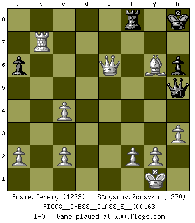 Last move : 1-0 2013 May 14 20:36:57 [Event "FICGS__CHESS__CLASS_E__000163"] [Site "FICGS"] [Date "2013.05.10"] [Round "1"] [White "Frame,Jeremy"] [Black "Stoyanov,Zdravko"] [Result "1-0"] [WhiteElo "1223"] [BlackElo "1270"] 1.e4 c5 2.Nf3 a6 3.d4 cxd4 4.Nxd4 e6 5.Nc3 Bb4 6.Bd3 Bxc3+ 7.bxc3 h6 8.Bb2 Nf6 9.O-O O-O 10.c4 Qb6 11.Rb1 Qa5 12.Qc1 Qh5 13.Nf3 Ng4 14.h3 Nf6 15.e5 Ne8 16.Ba3 d6 17.exd6 Bd7 18.Rxb7 Bc6 19.Qb2 Nxd6 20.Bxd6 Bxb7 21.Qxb7 Nc6 22.Bxf8 Rxf8 23.Qxc6 Qa5 24.Qe4 g6 25.Nh4 Qh5 26.Rb1 Re8 27.Qc6 Rf8 28.Nxg6 fxg6 29.Qxe6+ Kg7 30.Rb7+ Kh8 31.Bxg6 1-0 Sicilian : O'Kelly variation Kingside Castling by player White (move 9) Kingside Castling by player Black (move 9) Player White won this chess game. Follow this game move after move (download)As one by one I mowed them down, my superiority soon became apparent. (Jose Capablanca) Bis jetzt ist Weiß einer wohlbekannten Analyse gefolgt. Aber jetzt begeht er einen schrecklichen Fehler: Er beginnt seinen eigenen Kopf zu benutzen. (Siegbert Tarrasch) Tu eres para mi la Reina en d8 y yo soy el Peón en d7!!. (GM Eduard Gufeld) Votre prénom est 'Tactique', votre deuxième prénom est 'Tactique' et votre nom est 'Tactique'. (Ken Smith) Ah, the Socrating method. The best way we have of teaching everything-apart from juggling chainsaws. (Gregory House, House M.D.)