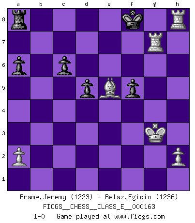 Last move : 1-0 2013 June 4 18:48:26 [Event "FICGS__CHESS__CLASS_E__000163"] [Site "FICGS"] [Date "2013.05.10"] [Round "1"] [White "Frame,Jeremy"] [Black "Belaz,Egidio"] [Result "1-0"] [WhiteElo "1223"] [BlackElo "1236"] 1.e4 e5 2.Nf3 Nc6 3.d4 exd4 4.Nxd4 Ne5 5.Bf4 Ng6 6.Bg3 Bc5 7.c3 N8e7 8.Bc4 O-O 9.Nd2 a6 10.N2f3 d6 11.O-O c6 12.Nf5 Nxf5 13.exf5 Bxf5 14.Bd3 Bg4 15.Bxg6 fxg6 16.Re1 Qb6 17.Re7 Qxb2 18.Rb1 Bxf3 19.gxf3 Qxc3 20.R1xb7 d5 21.Be5 Bxf2+ 22.Kxf2 Rxf3+ 23.Qxf3 Qc2+ 24.Kg3 Qf5 25.Qxf5 gxf5 26.Rxg7+ Kf8 27.Rxh7 Kg8 28.Rbg7+ Kf8 29.Rh8+ 1-0 Scotch game Kingside Castling by player Black (move 8) Kingside Castling by player White (move 11) Player White won this chess game. Follow this game move after move (download)Becoming successful at Chess allows you to discover your own personality. That's what I want for the kids I teach. (Saudin Robovic) Es hat in meinem Leben Zeiten gegeben, in denen das Schachspiel, wenn nicht zum Lebenszweck, so doch zu einem regelrechten Lebensersatz geworden ist. Man fühlt sich in solchen Zeiten nicht so, als besäße man eine göttliche Gabe, sondern eher so, als sei man von ihr besessen. (Garry Kasparov) La estratégia requiere pensar, la táctica requiere observación. (Max Euwe) Si rien de grave n'est détecté lors de l'analyse d'une position, on joue alors le coup. Seconde règle de Blumenfeld. Wipe them out. All of them. (Darth Sidious in Star Wars ep.1)