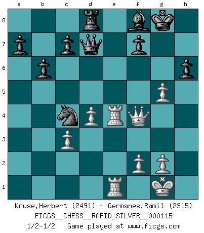 Last move : 1/2-1/2 2013 May 18 9:30:56 [Event "FICGS__CHESS__RAPID_SILVER__000115"] [Site "FICGS"] [Date "2013.05.11"] [Round "1"] [White "Kruse,Herbert"] [Black "Germanes,Ramil"] [Result "1/2-1/2"] [WhiteElo "2491"] [BlackElo "2315"] 1.e4 e5 2.Nf3 Nf6 3.Nxe5 d6 4.Nf3 Nxe4 5.d4 d5 6.Bd3 Nc6 7.O-O Be7 8.c4 Nb4 9.Be2 O-O 10.Nc3 Bf5 11.a3 Nxc3 12.bxc3 Nc6 13.Re1 Re8 14.cxd5 Qxd5 15.Bf4 Rac8 16.h3 h6 17.Nd2 Na5 18.Bf3 Qd7 19.Ne4 Rcd8 20.Ra2 b6 21.Rae2 Bxa3 22.Bg4 Be6 23.Bxh6 Bxg4 24.hxg4 Rxe4 25.Rxe4 gxh6 26.Qd2 Bf8 27.g5 Nc4 28.Qf4 Nd6 29.Re5 Nc4 30.R5e4 Nd6 31.Re5 Nc4 32.R5e4 1/2-1/2 Petrov : Classical attack Kingside Castling by player White (move 7) Kingside Castling by player Black (move 9) This chess game ended in a draw. Follow this game move after move (download)When you are lonely, when you feel yourself an alien in the world, play Chess. This will raise your spirits and be your counselor in war. (Aristotle) Alles was am Schachbrett zählt sind gute Züge. (Robert James Fischer) El arma más poderosa en el Ajedrez, es tener la próxima movida. (David Bronstein) Mais n'est-ce pas déjà le limiter injurieusement que d'appeler les échecs un jeu? N'est-ce pas aussi une science, un art, ou quelque chose qui, comme le cercueil de Mahomet entre ciel et terre, est suspendu entre l'un et l'autre, et qui réunit un nombre incroyable de contraires ? (Stefan Zweig) Treat your password like your toothbrush. Don't let anybody else use it, and get a new one every six months. (Clifford Stoll)