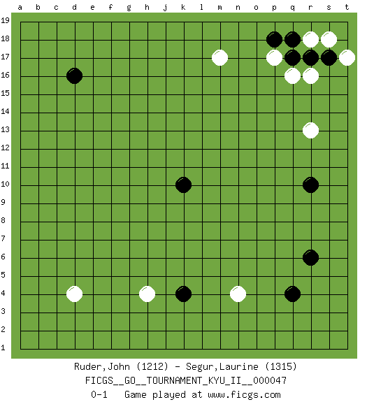 Last move : 0-1 2013 August 7 5:16:2 [Event "FICGS__GO__TOURNAMENT_KYU_II__000047"] [Site "FICGS"] [Date "2013.05.11"] [Round "1"] [Black "Ruder,John"] [White "Segur,Laurine"] [Result "0-1"] [Rating 1 "1212"] [Rating 2 "1315"] 1.d16 q16 2.q4 d4 3.k10 h4 4.k4 n4 5.r6 r13 6.r10 m17 7.r17 r16 8.q17 p17 9.p18 r18 10.q18 s18 11.s17 t17 0-1 This go game has been lost on time (started : 2013.05.11 23:21:59) Here are the names of the openings (joseki) played in the four corners : Corner q4 : q4 n4 Hoshi (Hwajeom, Seongjeom, Xingwei`) 4-4 Point. The star or hoshi (4-4) point, emphasizing influence at the potential expense of territory. Niken Takagakari (Dukan Nop'dakeolch'im, E`r Gaojia, 2-Space High Approach). White 2 is a light approach move. Rarely played in even games, White 2 is typically employed in handicap games. Black continues with 6-4 or 3-10. In Korean Sunjang Baduk Black has a stone on 8-4. Player White won this Go (weiqi, baduk) game. Follow this game move after move (download)There is death in the hane. (Anonymous) Employ the attack like tactic of defense. (Chinese proverb)