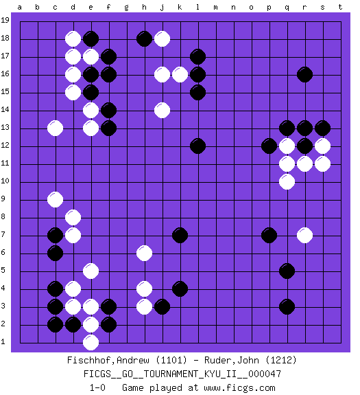 Last move : 1-0 2013 August 5 5:12:14 [Event "FICGS__GO__TOURNAMENT_KYU_II__000047"] [Site "FICGS"] [Date "2013.05.11"] [Round "1"] [Black "Fischhof,Andrew"] [White "Ruder,John"] [Result "1-0"] [Rating 1 "1101"] [Rating 2 "1212"] 1.r16 d16 2.q3 d4 3.f17 c13 4.l17 j16 5.l15 k16 6.l16 e17 7.f16 e14 8.c6 c9 9.f3 e5 10.c3 d3 11.c4 d7 12.d2 e2 13.c2 e3 14.f2 e1 15.c7 d8 16.k4 h3 17.j3 h4 18.q5 q10 19.q13 r7 20.p7 r11 21.r12 s12 22.s13 q12 23.r13 s11 24.p12 q11 25.k7 h6 26.l12 j14 27.h18 j18 28.e18 d18 29.e16 d17 30.e15 d15 31.f14 e13 32.f13 1-0 This go game has been lost on time (started : 2013.05.11 23:21:59) Here are the names of the openings (joseki) played in the four corners : Corner d16 : d16 f17 Hoshi (Hwajeom, Seongjeom, Xingwei`) 4-4 Point. The star or hoshi (4-4) point, emphasizing influence at the potential expense of territory. Ikken Kakari (Hankan Keolch'im, Yi Gua`jiao~, 1-Space Low Approach). Black 2 is the standard approach move to the 4-4. Corner d4 : d4 c6 Hoshi (Hwajeom, Seongjeom, Xingwei`) 4-4 Point. The star or hoshi (4-4) point, emphasizing influence at the potential expense of territory. Ikken Kakari (Hankan Keolch'im, Yi Gua`jiao~, 1-Space Low Approach). Black 2 is the standard approach move to the 4-4. Player Black won this Go (weiqi, baduk) game. Follow this game move after move (download)The L-group is dead. (Anonymous) This is where the fun begins. (Anakin Skywalker in Star Wars ep.3)