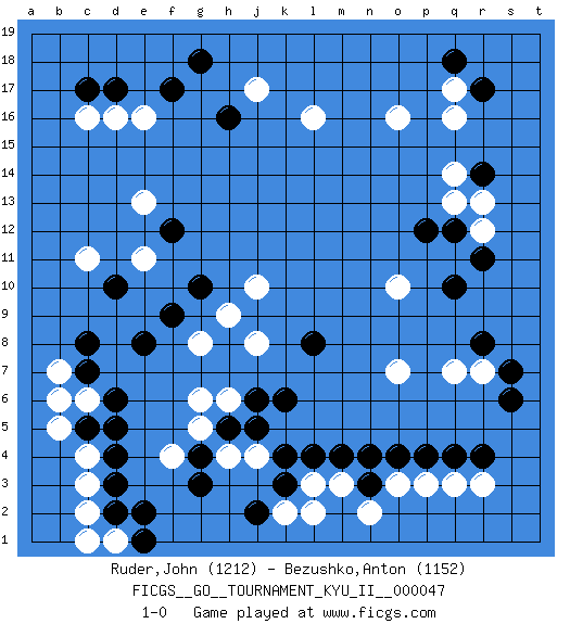 Last move : 1-0 2013 October 8 3:28:29 [Event "FICGS__GO__TOURNAMENT_KYU_II__000047"] [Site "FICGS"] [Date "2013.05.11"] [Round "1"] [Black "Ruder,John"] [White "Bezushko,Anton"] [Result "1-0"] [Rating 1 "1212"] [Rating 2 "1152"] 1.q4 d16 2.d4 q16 3.r14 o16 4.q10 c6 5.c8 c11 6.d6 c3 7.d3 c4 8.c5 b5 9.d5 b7 10.c7 b6 11.f17 j17 12.c17 c16 13.d17 e16 14.g18 l16 15.h16 o3 16.k3 r3 17.r4 q3 18.p4 p3 19.n4 q7 20.s6 o7 21.o4 o10 22.r8 r7 23.s7 c2 24.d2 d1 25.e1 c1 26.e2 h4 27.j6 g6 28.h5 g5 29.g4 f4 30.g3 j4 31.k6 m3 32.n3 n2 33.l4 l3 34.k4 k2 35.j2 l2 36.m4 g8 37.g10 h6 38.j5 j8 39.l8 j10 40.e8 h9 41.f9 e11 42.f12 e13 43.d10 r12 44.q12 q13 45.p12 r13 46.r11 q14 47.r17 q17 48.q18 1-0 This go game has been lost on time (started : 2013.05.11 23:21:59) Here are the names of the openings (joseki) played in the four corners : Corner q16 : q16 r14 Hoshi (Hwajeom, Seongjeom, Xingwei`) 4-4 Point. The star or hoshi (4-4) point, emphasizing influence at the potential expense of territory. Ikken Kakari (Hankan Keolch'im, Yi Gua`jiao~, 1-Space Low Approach). Black 2 is the standard approach move to the 4-4. Corner d4 : d4 c6 Hoshi (Hwajeom, Seongjeom, Xingwei`) 4-4 Point. The star or hoshi (4-4) point, emphasizing influence at the potential expense of territory. Ikken Kakari (Hankan Keolch'im, Yi Gua`jiao~, 1-Space Low Approach). White 2 is the standard approach move to the 4-4. Corner q4 : q4 o3 Hoshi (Hwajeom, Seongjeom, Xingwei`) 4-4 Point. The star or hoshi (4-4) point, emphasizing influence at the potential expense of territory. Ikken Kakari (Hankan Keolch'im, Yi Gua`jiao~, 1-Space Low Approach). White 2 is the standard approach move to the 4-4. Player Black won this Go (weiqi, baduk) game. Follow this game move after move (download)Attach to the strongest stone in a pincer. (Anonymous) To be champion requires more than simply being a strong player; one has to be a strong human being as well. (Anatoly Karpov)