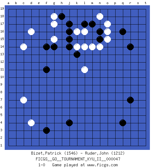 Last move : 1-0 2013 July 24 15:3:16 [Event "FICGS__GO__TOURNAMENT_KYU_II__000047 "] [Site "FICGS"] [Date "2013.05.11"] [Round "1"] [Black "Bizet,Patrick "] [White "Ruder,John "] [Result "1-0"] [Rating 1 "1546"] [Rating 2 "1212"] 1.q4 d16 2.q16 d4 3.f3 c7 4.j4 o17 5.m17 o15 6.r14 l16 7.n16 o16 8.n15 n14 9.l17 k16 10.j17 g17 11.h18 g18 12.r7 n18 13.j16 m14 14.j15 k14 15.j14 l11 16.f14 g15 17.g14 c14 18.k13 l14 19.f11 1-0 Here are the names of the openings (joseki) played in the four corners : Corner d4 : d4 f3Hoshi (Hwajeom, Seongjeom, Xingwei`) 4-4 Point. The star or hoshi (4-4) point, emphasizing influence at the potential expense of territory.Ikken Kakari (Hankan Keolch'im, Yi Gua`jiao~, 1-Space Low Approach). Black 2 is the standard approach move to the 4-4. Corner q16 : q16 o17Hoshi (Hwajeom, Seongjeom, Xingwei`) 4-4 Point. The star or hoshi (4-4) point, emphasizing influence at the potential expense of territory.Ikken Kakari (Hankan Keolch'im, Yi Gua`jiao~, 1-Space Low Approach). White 2 is the standard approach move to the 4-4. Corner d16 : d16 j17Hoshi (Hwajeom, Seongjeom, Xingwei`) 4-4 Point. The star or hoshi (4-4) point, emphasizing influence at the potential expense of territory. Player Black won this Go (weiqi, baduk) game.Follow this game move after move (download ) Capture what you cut off. (Anonymous) It is a good thing for an uneducated man to read books of quotations. (Winston Churchill)