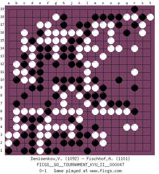 Last move : 0-1 2013 June 25 8:55:34 [Event "FICGS__GO__TOURNAMENT_KYU_II__000047"] [Site "FICGS"] [Date "2013.05.11"] [Round "1"] [Black "Denisenkov,Valentin"] [White "Fischhof,Andrew"] [Result "0-1"] [Rating 1 "1092"] [Rating 2 "1101"] 1.q16 c16 2.d4 q4 3.e16 d14 4.c12 c6 5.c8 c10 6.d9 d10 7.e9 e6 8.e10 d12 9.d11 c11 10.e11 b12 11.c13 d13 12.b10 b11 13.f4 g6 14.g8 o16 15.l16 m16 16.l17 l15 17.k15 r14 18.r17 s16 19.p17 p14 20.r9 r11 21.r6 n3 22.p10 r4 23.k4 b4 24.c3 b3 25.b2 h4 26.h3 g4 27.g3 c4 28.d3 f5 29.d5 d6 30.c5 b5 31.b7 b6 32.f7 e4 33.e5 f3 34.f2 j3 35.j2 g2 36.h2 e2 37.g1 c2 38.d2 e1 39.d1 e3 40.c1 a2 41.f1 f4 42.f6 j4 43.k3 h7 44.j5 h6 45.a1 a3 46.k7 h8 47.h9 g9 48.g10 j9 49.h10 k8 50.j7 l7 51.j8 k6 52.k9 j6 53.j10 l9 54.k10 q6 55.q7 p6 56.p7 l2 57.k2 s17 58.m15 g14 59.f14 f15 60.g15 f16 61.n15 o15 62.n16 o17 63.s18 q18 64.p18 r18 65.r19 t18 66.o18 n17 67.n18 m17 68.m18 l14 69.m13 m14 70.n14 n13 71.l13 k14 72.j14 k13 73.k12 o14 74.j13 h15 75.j15 h16 76.h14 g13 77.f13 f17 78.g12 g16 79.h13 g15 80.e12 k16 81.k17 j16 82.h18 g18 83.h17 e17 84.e14 e15 85.d15 c15 86.e13 c14 87.m8 l12 88.j12 m12 89.l8 k5 90.m2 n2 91.l3 m3 92.l1 o6 93.m4 m6 94.m7 m9 95.n9 n7 96.n8 l11 97.m10 l10 98.o7 n6 0-1 Here are the names of the openings (joseki) played in the four corners : Corner d16 : c16 e16 Komoku (Somok, Xiao~mu`) 3-4 Point. The komoku (3-4) point is the traditional corner enclosure move.. Ikken Takagakari (Hankan Nop'dakeolch'im, Yi Gaogua`jiao~, 1-Space High Approach). The 5-4 approach move has become more popular in modern times, as modern Go emphasizes speed and influence. Corner d4 : d4 c6 Hoshi (Hwajeom, Seongjeom, Xingwei`) 4-4 Point. The star or hoshi (4-4) point, emphasizing influence at the potential expense of territory. Ikken Kakari (Hankan Keolch'im, Yi Gua`jiao~, 1-Space Low Approach). White 2 is the standard approach move to the 4-4. Corner q16 : q16 o16 Hoshi (Hwajeom, Seongjeom, Xingwei`) 4-4 Point. The star or hoshi (4-4) point, emphasizing influence at the potential expense of territory. Ikken Takagakari (Hankan Nop'dakeolch'im, Yi Gaojia, 1-Space High Approach). Black typically responds at 6-4 or 3-10. Black 4-10 is played when Black finds play on the right side advantageous. Black 4-8 or 3-8 may be played when Black has support at top. Corner q4 : q4 r9 Hoshi (Hwajeom, Seongjeom, Xingwei`) 4-4 Point. The star or hoshi (4-4) point, emphasizing influence at the potential expense of territory. Player White won this Go (weiqi, baduk) game. Follow this game move after move (download)Knight's moves win running battles. (Anonymous) May I never be complete. May I never be content. May I never be perfect. Deliver me, Tyler, from being perfect and complete. (Chuck Palahniuk, Fight Club)