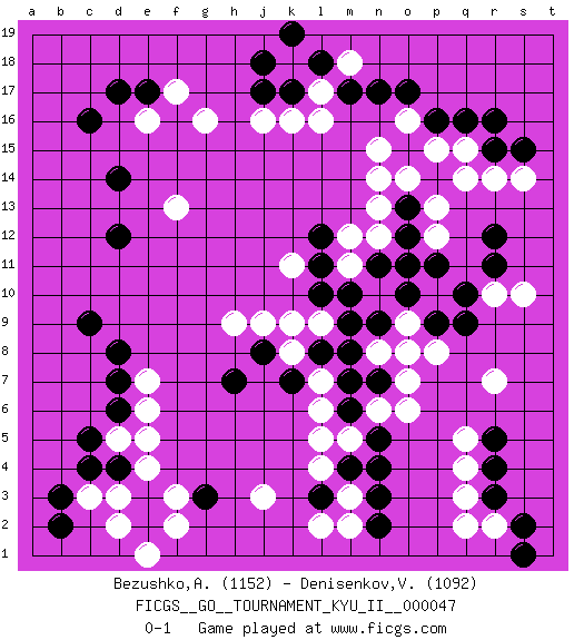 Last move : 0-1 2013 May 28 7:27:3 [Event "FICGS__GO__TOURNAMENT_KYU_II__000047"] [Site "FICGS"] [Date "2013.05.11"] [Round "1"] [Black "Bezushko,Anton"] [White "Denisenkov,Valentin"] [Result "0-1"] [Rating 1 "1152"] [Rating 2 "1092"] 1.q16 d3 2.c16 q4 3.c5 d5 4.d6 e5 5.c4 c3 6.c9 e16 7.e17 f17 8.d17 g16 9.d14 l17 10.q10 l4 11.n17 r7 12.j17 j16 13.k17 k16 14.l18 k18 15.m17 l16 16.j18 f13 17.d12 e6 18.d7 e7 19.d8 r14 20.r15 q14 21.r12 p12 22.o10 p8 23.o15 n12 24.m10 n8 25.l12 n14 26.o13 o14 27.o12 o11 28.p11 p13 29.n11 n13 30.o11 q15 31.r16 m18 32.k19 o16 33.o17 n15 34.p16 p15 35.g3 j3 36.d4 e4 37.e3 f3 38.e2 f2 39.b3 e1 40.b2 d2 41.l8 l7 42.r3 q3 43.r4 q5 44.r5 r2 45.s2 q2 46.s1 s14 47.s15 s10 48.h7 h9 49.j8 k9 50.k7 k8 51.m7 l6 52.m8 n6 53.m6 m5 54.l10 j9 55.n7 o7 56.n5 o6 57.n4 m3 58.n3 m2 59.n2 k11 60.m4 l5 61.l3 l2 62.n9 o8 63.l11 l9 64.m9 m12 65.r11 r10 66.p9 o9 67.q9 m11 0-1 Here are the names of the openings (joseki) played in the four corners : Corner d4 : d3 c5 Komoku (Somok, Xiao~mu`) 3-4 Point. The komoku (3-4) point is the traditional corner enclosure move.. Ikken Kakari (Hankan Keolch'im, Yi Gua`jiao~, 1-Space Low Pincer). The small knight move is the basic approach move to the 3-4 point stone. It has been continually used for over four centuries. There are limitless variations, with new moves constantly being discovered. Black 2 opens the door to a treaure store of joseki. Corner d16 : c16 e16 Komoku (Somok, Xiao~mu`) 3-4 Point. The komoku (3-4) point is the traditional corner enclosure move.. Ikken Takagakari (Hankan Nop'dakeolch'im, Yi Gaogua`jiao~, 1-Space High Approach). The 5-4 approach move has become more popular in modern times, as modern Go emphasizes speed and influence. Corner q16 : q16 l17 Hoshi (Hwajeom, Seongjeom, Xingwei`) 4-4 Point. The star or hoshi (4-4) point, emphasizing influence at the potential expense of territory. Player White won this Go (weiqi, baduk) game. Follow this game move after move (download)Strange things happen at the one-two points. (Anonymous) The leaves of memory seemed to make a mournful rustling in the dark. (Henry Wadsworth Longfellow)