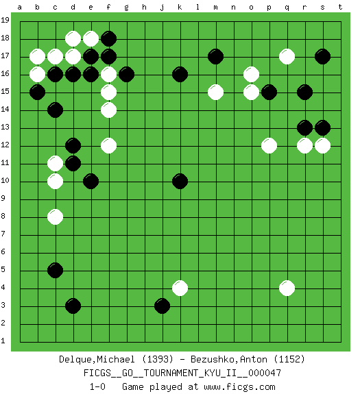 Last move : 1-0 2013 July 27 16:17:6 [Event "FICGS__GO__TOURNAMENT_KYU_II__000047"] [Site "FICGS"] [Date "2013.05.11"] [Round "1"] [Black "Delque,Michael"] [White "Bezushko,Anton"] [Result "1-0"] [Rating 1 "1393"] [Rating 2 "1152"] 1.d3 q17 2.c5 q4 3.d16 k4 4.r15 r12 5.p15 o16 6.k16 p12 7.s17 m15 8.m17 o15 9.s13 s12 10.r13 c10 11.d11 c11 12.k10 f16 13.e17 c17 14.c16 d17 15.e16 e18 16.f18 d18 17.f17 b16 18.b15 b17 19.c14 f14 20.g16 f15 21.d12 f12 22.e10 c8 23.j3 1-0 This go game has been lost on time (started : 2013.05.11 23:21:59) Here are the names of the openings (joseki) played in the four corners : Corner q16 : q17 r15 Komoku (Somok, Xiao~mu`) 3-4 Point. The komoku (3-4) point is the traditional corner enclosure move.. Ikken Kakari (Hankan Keolch'im, Yi Gua`jiao~, 1-Space Low Pincer). The small knight move is the basic approach move to the 3-4 point stone. It has been continually used for over four centuries. There are limitless variations, with new moves constantly being discovered. Black 2 opens the door to a treaure store of joseki. Player Black won this Go (weiqi, baduk) game. Follow this game move after move (download)On the second line six die, eight live. (Anonymous) Big Chess is a place for big hallucinations. (Thibault de Vassal)