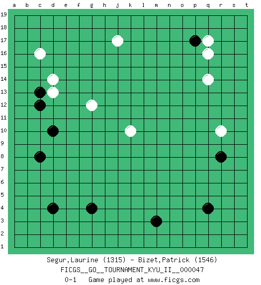 Last move : 0-1 2013 July 5 22:42:52 [Event "FICGS__GO__TOURNAMENT_KYU_II__000047"] [Site "FICGS"] [Date "2013.05.11"] [Round "1"] [Black "Segur,Laurine"] [White "Bizet,Patrick"] [Result "0-1"] [Rating 1 "1315"] [Rating 2 "1546"] 1.d4 q16 2.q4 c16 3.c8 j17 4.m3 r10 5.r8 q14 6.c12 d13 7.c13 d14 8.d10 g12 9.g4 k10 10.p17 q17 0-1 Here are the names of the openings (joseki) played in the four corners : Player White won this Go (weiqi, baduk) game. Follow this game move after move (download)Only amateurs try to come up with fancy moves. (Anonymous) All war is based on deception. (Sun Tzu)