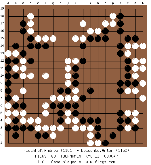 Last move : 1-0 2013 October 18 16:29:26 [Event "FICGS__GO__TOURNAMENT_KYU_II__000047"] [Site "FICGS"] [Date "2013.05.11"] [Round "1"] [Black "Fischhof,Andrew"] [White "Bezushko,Anton"] [Result "1-0"] [Rating 1 "1101"] [Rating 2 "1152"] 1.q16 d4 2.q3 d17 3.q9 o17 4.o16 n16 5.o15 p17 6.q17 l17 7.q14 k4 8.d15 d10 9.c17 d16 10.c16 e15 11.d14 d18 12.c6 c8 13.c3 c4 14.d3 e3 15.b4 b5 16.b2 a4 17.b3 c5 18.e2 f3 19.f2 g3 20.n4 r3 21.r4 s4 22.s3 r5 23.q4 s5 24.q5 r8 25.r9 s8 26.e14 f15 27.n15 m16 28.m15 l15 29.l14 k15 30.q8 s10 31.s9 t9 32.r10 s11 33.r11 s12 34.t10 t11 35.s13 r13 36.r12 s14 37.t13 r14 38.r15 t14 39.q13 t12 40.t8 t7 41.d12 f10 42.k10 k7 43.m8 j9 44.f14 g15 45.b10 c11 46.b12 b11 47.a11 c12 48.c13 b13 49.a12 a10 50.a9 a13 51.a10 c10 52.a8 b7 53.b14 m3 54.n3 m2 55.n2 n1 56.o1 m1 57.p2 g2 58.m4 l3 59.k9 j10 60.j8 k8 61.h8 j11 62.b6 a6 63.a7 a5 64.a3 e4 65.l4 j4 66.k5 j5 67.k6 j7 68.j6 h7 69.h6 f6 70.l7 g7 71.g6 f5 72.h4 h3 73.h5 k3 74.k11 j12 75.q18 p18 76.s15 k12 77.l12 1-0 This go game has been lost on time (started : 2013.05.11 23:21:59) Here are the names of the openings (joseki) played in the four corners : Corner q16 : q16 o17 Hoshi (Hwajeom, Seongjeom, Xingwei`) 4-4 Point. The star or hoshi (4-4) point, emphasizing influence at the potential expense of territory. Ikken Kakari (Hankan Keolch'im, Yi Gua`jiao~, 1-Space Low Approach). White 2 is the standard approach move to the 4-4. Corner d16 : d17 d15 Komoku (Somok, Xiao~mu`) 3-4 Point. The komoku (3-4) point is the traditional corner enclosure move.. Ikken Takagakari (Hankan Nop'dakeolch'im, Yi Gaogua`jiao~, 1-Space High Approach). The 5-4 approach move has become more popular in modern times, as modern Go emphasizes speed and influence. Corner d4 : d4 c6 Hoshi (Hwajeom, Seongjeom, Xingwei`) 4-4 Point. The star or hoshi (4-4) point, emphasizing influence at the potential expense of territory. Ikken Kakari (Hankan Keolch'im, Yi Gua`jiao~, 1-Space Low Approach). Black 2 is the standard approach move to the 4-4. Player Black won this Go (weiqi, baduk) game. Follow this game move after move (download)Win the stones, lose the game. (Anonymous) After growing wildly for years, the field of computing appears to be reaching its infancy. (John Pierce)