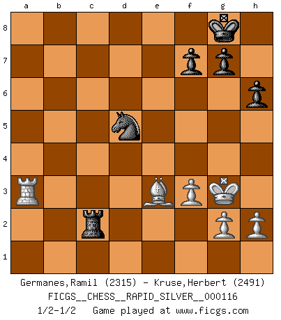 Last move : 1/2-1/2 2013 June 2 0:19:47 [Event "FICGS__CHESS__RAPID_SILVER__000116"] [Site "FICGS"] [Date "2013.05.12"] [Round "2"] [White "Germanes,Ramil"] [Black "Kruse,Herbert"] [Result "1/2-1/2"] [WhiteElo "2315"] [BlackElo "2491"] 1.d4 Nf6 2.c4 e6 3.Nc3 Bb4 4.e3 O-O 5.Bd3 d5 6.Nf3 c5 7.O-O Nc6 8.a3 Bxc3 9.bxc3 b6 10.cxd5 exd5 11.Ne5 Bb7 12.f3 Re8 13.Nxc6 Bxc6 14.Ra2 b5 15.a4 bxa4 16.Bc2 a5 17.Bxa4 Bxa4 18.Rxa4 Nd7 19.dxc5 Nxc5 20.Rd4 Qf6 21.Ba3 Rac8 22.Rxd5 Qxc3 23.Qc1 Na4 24.Qxc3 Nxc3 25.Rxa5 Rxe3 26.Rc1 h6 27.Kf1 Rd8 28.Bc5 Red3 29.Ra3 Rd1+ 30.Rxd1 Rxd1+ 31.Kf2 Rc1 32.Be3 Rc2+ 33.Kg3 Nd5 1/2-1/2 Nimzo-Indian : 4.e3 O-O, 5.Bd3 d5 Kingside Castling by player Black (move 4) Kingside Castling by player White (move 7) This chess game ended in a draw. Follow this game move after move (download)Chess, like any creative activity, can exist only through the combined efforts of those who have creative talent, and those who have the ability to organize their creative work. (Mikhail Botvinnik) Ein Buch ist ein Spiegel; wenn ein Affe hineinsieht, so kann kein Apostel heraus gucken. (Georg Christoph Lichtenberg) Los errores estan ahí, esperando a que se cometan. (Savielly Tartakower) La guerre est enfant de la passion, la passion est enfant du narcissisme et le narcissisme est l'enfant. (...) Une autre partie ? (Thibault de Vassal) Lamb in skin of tiger, still fears the wolf. (Chinese proverb)